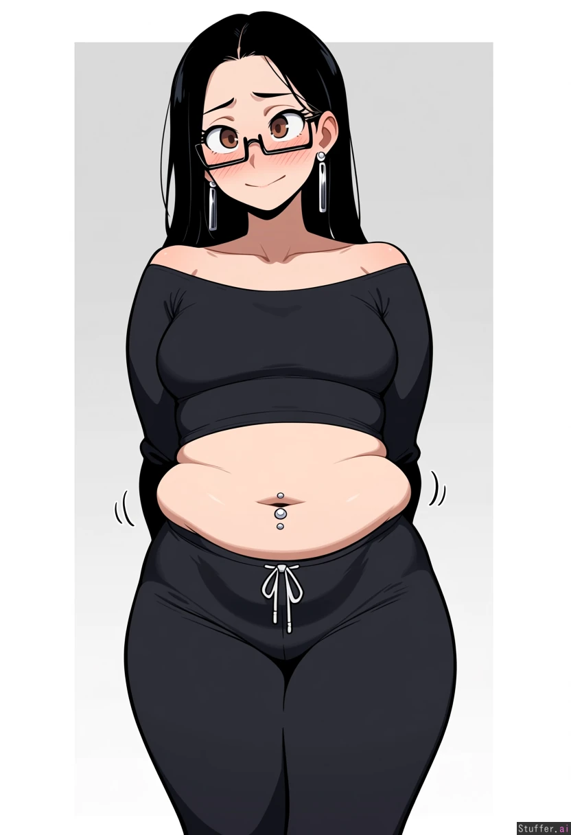 1girl, fair skin, rectangle glasses, black high-waist sweatpants, black fitted off-shoulder shirt, navel piercing, long black hair, silver earrings, brown eyes, big eyes, standing, hands_behind_back, skinny arms, shy smile, blush, big eyes, cute, slim legs, ((weight_gain:1.9)), motion_lines, breast_expansion, belly_expansion, bellyheavy