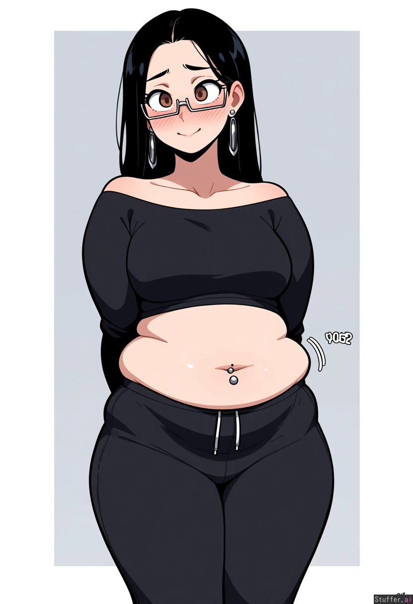 1girl, fair skin, rectangle glasses, black high-waist sweatpants, black fitted off-shoulder shirt, navel piercing, long black hair, silver earrings, brown eyes, big eyes, standing, hands_behind_back, shy smile, blush, big eyes, cute, ((weight_gain:1.9)), motion_lines, breast_expansion, belly_expansion, bellyheavy