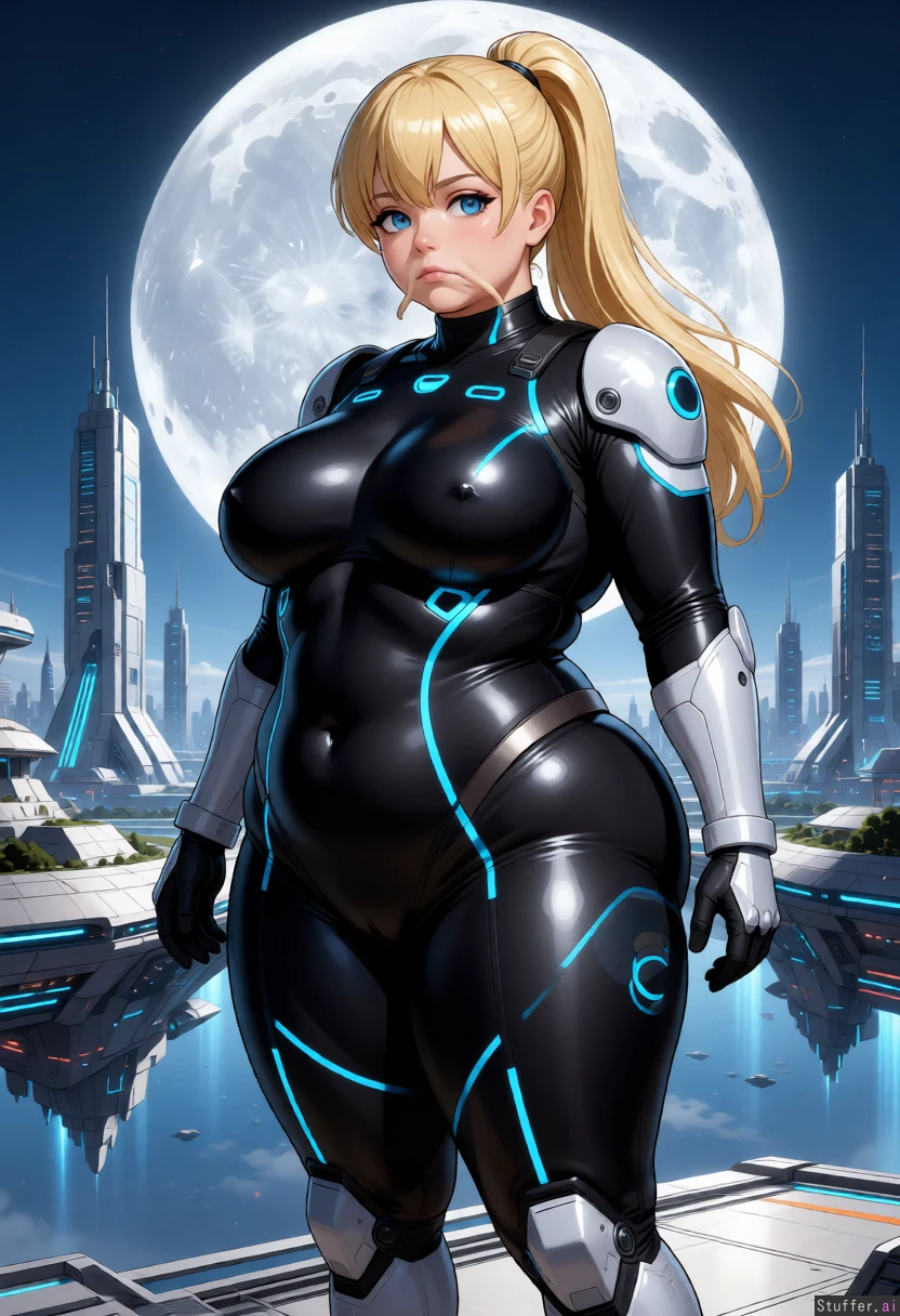 (masterpiece). (best quality). (ultra-detailed). (16k). (trending on Pixiv). (score_1). (score_9). (score_8). (score_7). (modern/contemporary art). (anime style). (manga style). (ecchi, ecchi style) (perfect 2D art). (modern 2D stylized look). (high rating). (HDR). (UHD). (smooth texture). (absurd res). (anime screen cap). (anime extract). (anime lineart). (1080p). (intricate detail). (highly detailed). (sophisticated quality). (detailed lighting). (best lighting). (light diffusion). (best shading). (official art). (official style). (realistic line art). Lewdlemage(artist:1.5), betterwithsalt(artist:1.5), usa37107692(artist:1.5), Ourobot(artist:1.5), blushyspicy(artist:1.5), spellsX(artist:1.5), Hews(artist:1.5), krekkov(artist:1.5), KAMII MOMORU(artist:1.5). (1women). (Samus Aran) (round face). (blue eyes). (blonde hair, long hair, hair tied into a ponytail). (huge breasts, huge podgy breasts, huge pudgy breasts, huge voluptuous breasts, huge chubby breasts, huge fat breasts, huge obese breasts, huge morbidly obese breasts, huge soft body, USSBBW, huge pudgy body, huge pudgy body, huge voluptuous body, huge chubby body, huge fat body, huge obese body, huge morbidly obese body, podgy shoulders, pudgy shoulders, voluptuous shoulders, chubby shoulders, fat shoulders, obese shoulders, morbidly obese shoulders, podgy thighs, pudgy thighs, voluptuous thighs, chubby thighs, fat thighs, obese thighs, morbidly obese thighs, podgy back, pudgy back, voluptuous back, chubby back, fat back, obese back, morbidly obese back, huge belly pooch, huge fat rolls, huge podgy waistline, huge pudgy waistline, huge voluptuous waistline, huge chubby waistline, huge fat waistline, huge obese waistline, huge morbidly obese waistline, huge podgy belly, huge pudgy belly, huge voluptuous belly, huge chubby belly, huge fat belly, huge obese belly, huge morbidly obese belly). large ass, pudgy ass, rotund face, chin rolls (Dutch angle). (Cowboy shot). (wearing a zero suit). (futuristic floating city). (moon in the background) (standing).