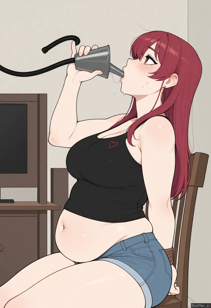 Solo, Krekkov (artist), KAMII MOMORU(artist), (Flat colors), perfect proportions, pale skin, houshou_marine(hololive), red shoulder length hair, flirty, (((black top, jean shorts))), living room, sitting on a chair, hands tied behind her back, (black hose in her mouth, funnel feeding, force feeding), (Side view), medium breasts, (Skinny, relaxed: -0.20) (Chubby, nervous, chubby belly: 1.20)
