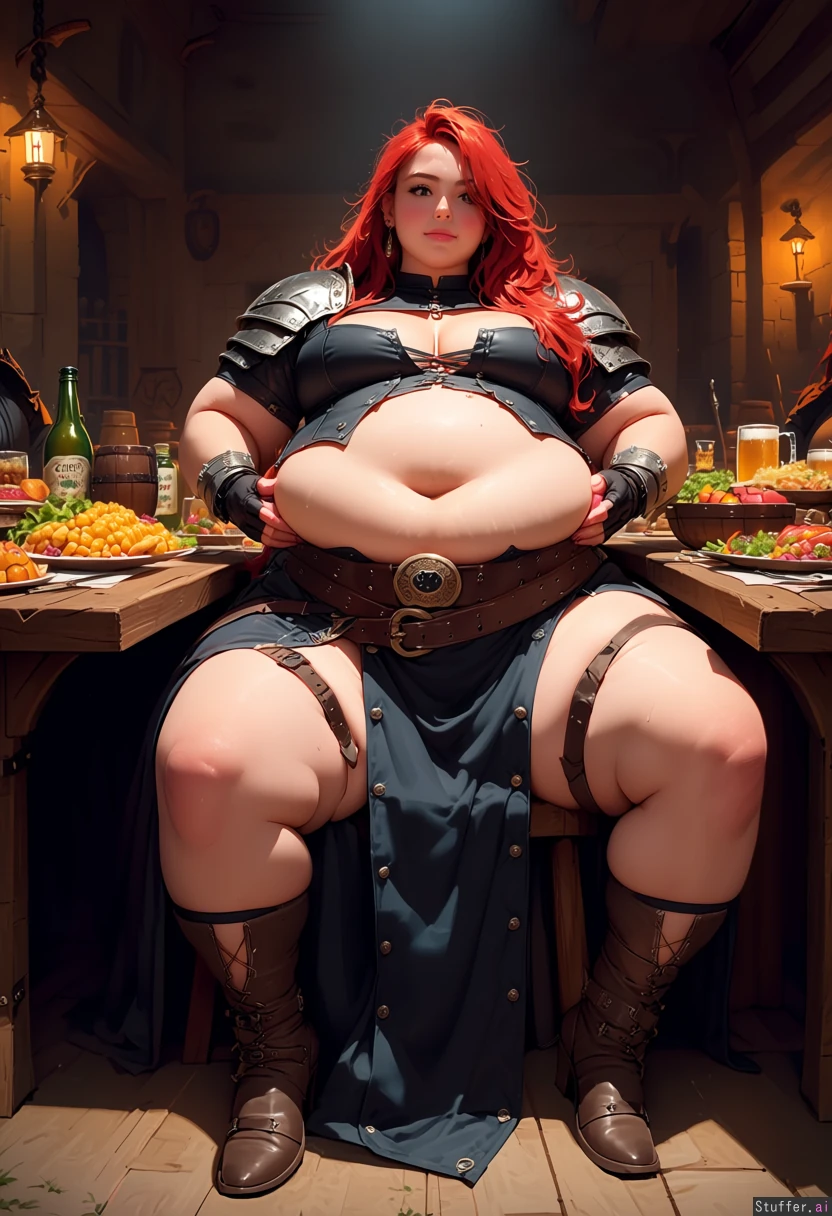 realistic beautiful barbarian woman is fanning her face with feast in front of her. has eaten too much. (sitting in chair) at table in the local tavern. leaning back in chair, very full, hands on belly. pretty chubby face, very tall, long messy red hair, fingerless gloves. (unbuttoned) dark high-waisted skirt with (unbuckled) large belt with round belt buckle. exposed thick soft thighs. leather clothes and straps. corset split wide open due to bloated fat belly. armor on shoulders. multiple earrings. overweight, heavyset, soft. big chest. (big soft belly:1.4), gained weight, very fat, very full. big belly squeezes against clothes, belly overhang, fat rolls. affable. table full of medieval foods. beer Stein on table