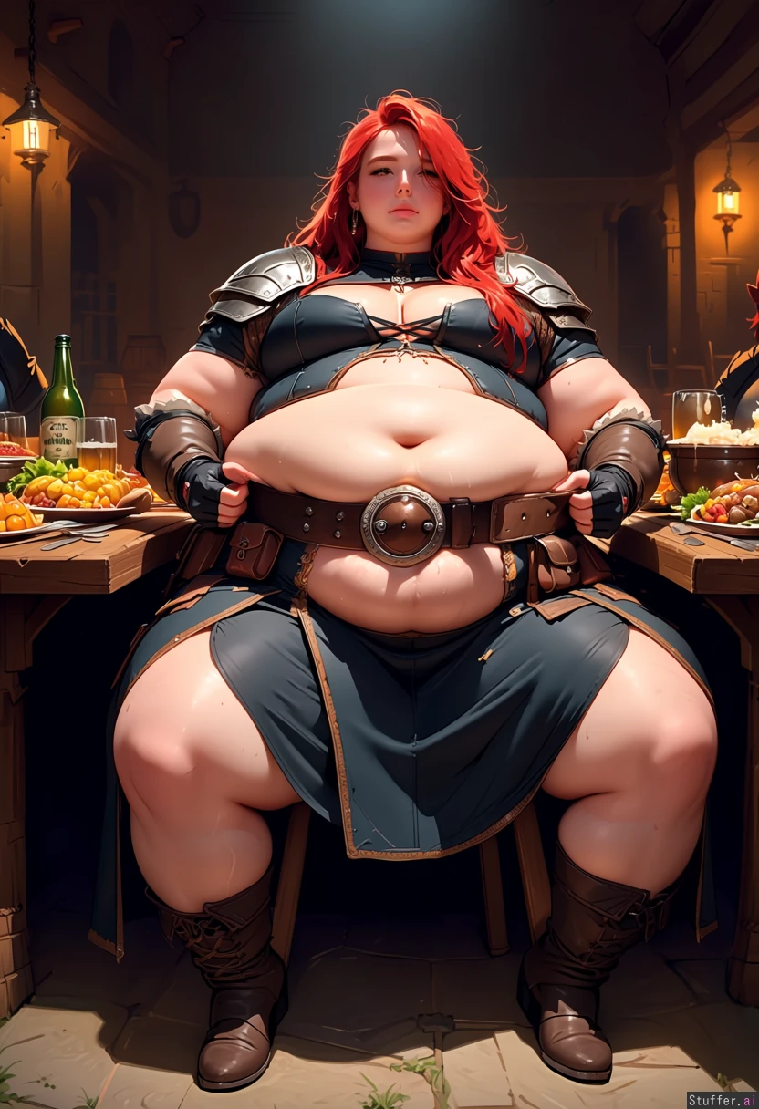 realistic beautiful barbarian woman with feast in front of her. has eaten too much. tipsy, tired. (sitting in chair) at table in the local tavern. leaning back in chair, very full. (hands gripping belt). pretty chubby face, very tall, long messy red hair, fingerless gloves. (unbuttoned) dark high-waisted skirt with large belt with round belt buckle below waist. fat belly bursting belt. exposed thick soft thighs. leather clothes and straps with pouches. corset split wide open due to bloated fat belly. armor on shoulders. multiple earrings. overweight, heavyset, soft. big chest. (big soft belly:1.5), gained weight, very fat, very full, (obese belly:1.3). obese. big belly squeezes against clothes, belly overhang, fat rolls. affable. table full of medieval foods. beer Stein on table