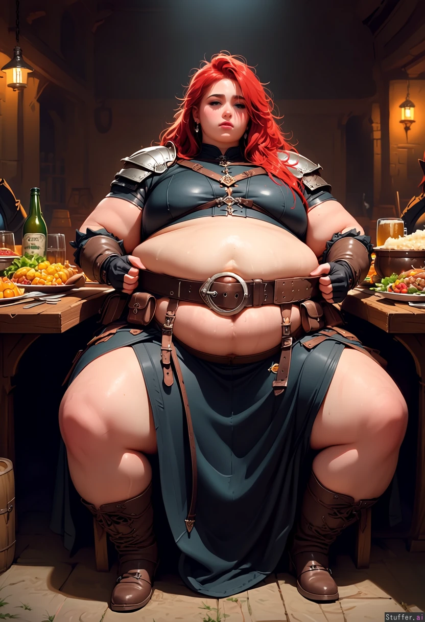 realistic beautiful barbarian woman with feast in front of her. has eaten too much. tipsy, tired. (sitting in chair) at table in the local tavern. leaning back in chair, very full. (hands gripping belt). pretty chubby face, very tall, long messy red hair, fingerless gloves. dark high-waisted skirt with large belt with round belt buckle worn below belly. fat belly bursting belt. exposed thick soft thighs. leather clothes and straps with pouches. corset split wide open due to bloated fat belly. armor on shoulders. multiple earrings. overweight, heavyset, soft. big chest. (big soft belly:1.5), gained weight, very fat, very full, (obese belly:1.3). obese. big belly squeezes against clothes, belly overhang, fat rolls. affable. table full of medieval foods. beer Stein on table