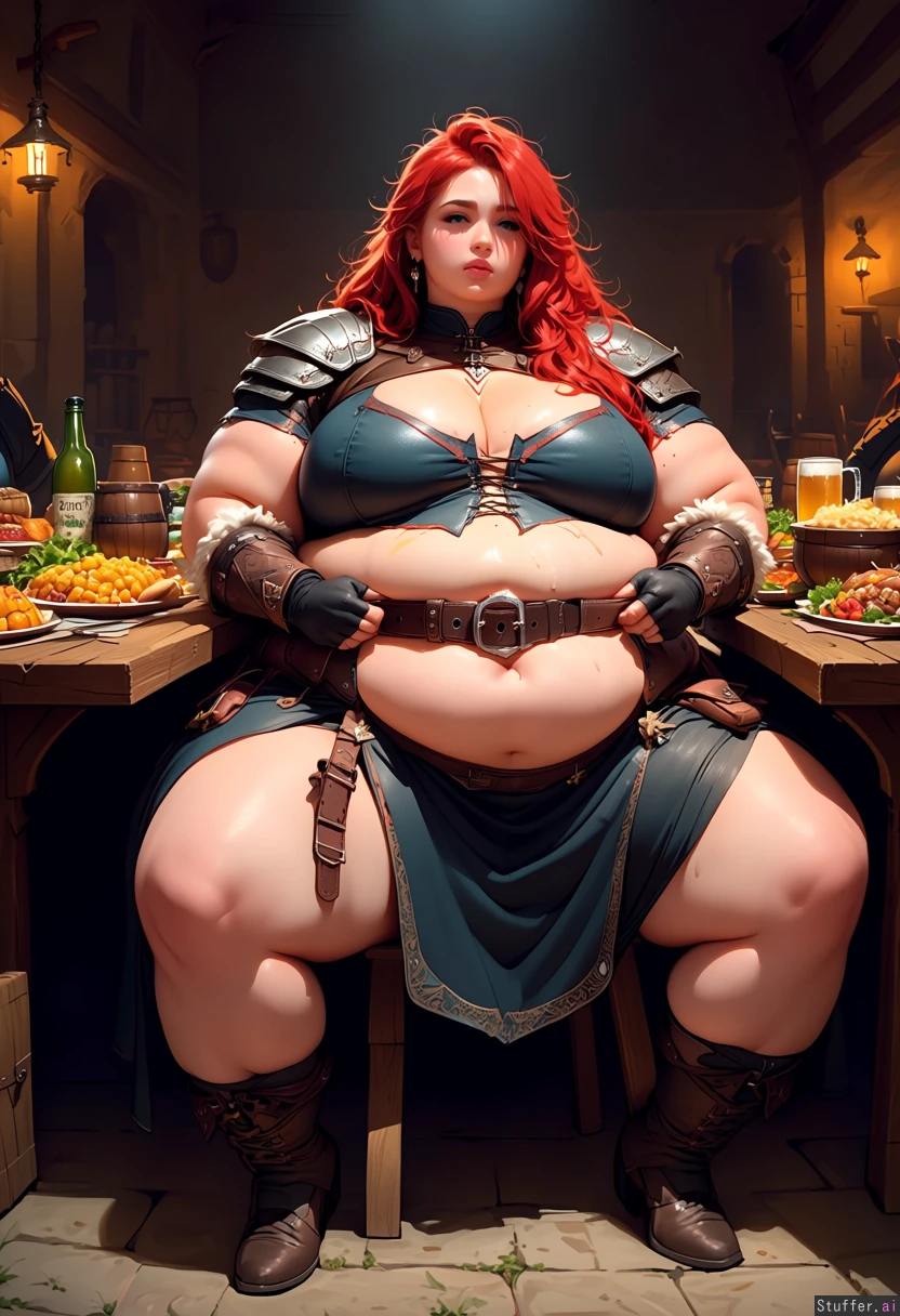 realistic beautiful barbarian woman with feast in front of her. has eaten too much. tipsy, tired. (sitting in chair) at table in the local tavern. leaning back in chair, very full. (hands gripping belt). pretty chubby face, very tall, long messy red hair, fingerless gloves. unbuttoned dark skirt. exposed thick soft thighs. leather clothes and straps with pouches. corset split wide open due to bloated fat belly. armor on shoulders. multiple earrings. overweight, heavyset, soft. big chest. (big soft belly:1.5), gained weight, very fat, very full, (obese belly:1.3). obese. big belly squeezes against clothes, belly overhang, fat rolls. affable. table full of medieval foods. beer Stein on table