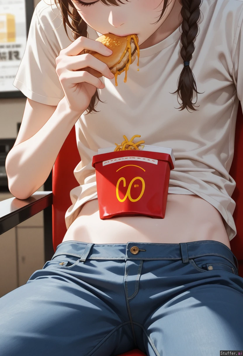 ((Sitting down, eating at fast food restaurant))