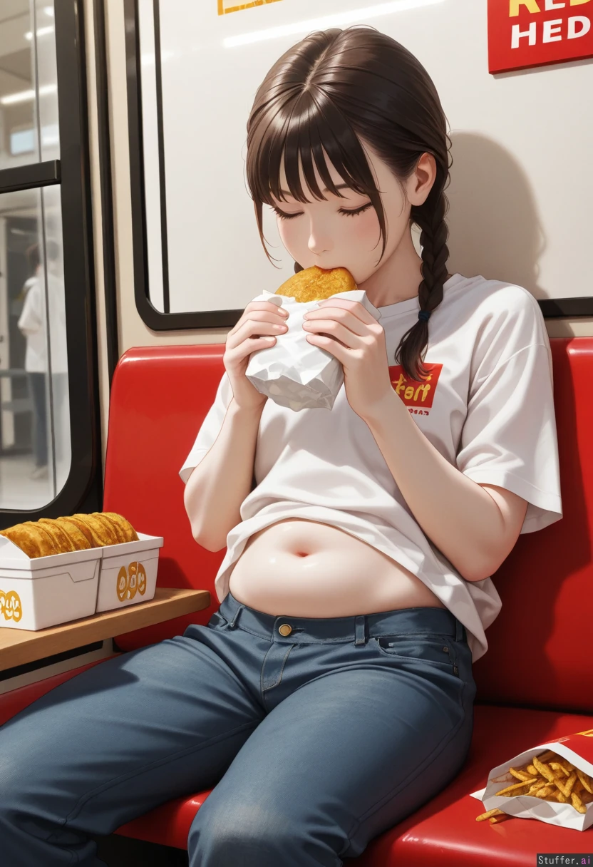 ((Sitting down, eating at fast food restaurant))