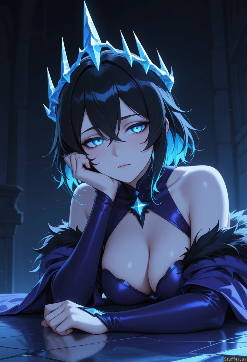 kislev ice witch, resting head on hand, black hair, glowing blue eyes, shoulders exposed, fur lined royal purple clothes, boobs, playfull, exhausted tired tipsy