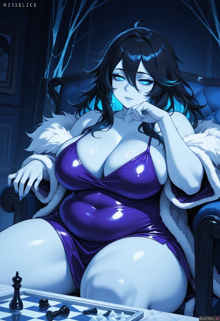 kislev ice witch, resting head on hand, long black messy hair, glowing blue eyes, shoulders exposed,, boobs, playful tipsy milf, white_fur_lined coat purple clothes, ice chess, ((fat)) chubby thick thighs