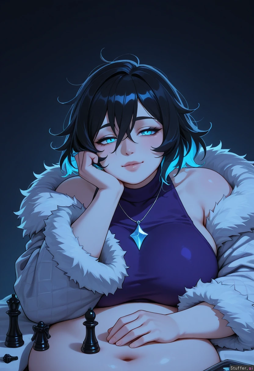 kislev ice witch, resting head on hand, long black messy hair, glowing blue eyes, shoulders exposed,, boobs, playful tipsy milf, fur_lined coat purple clothes, ice chess, ((((fat)) chubby thick))