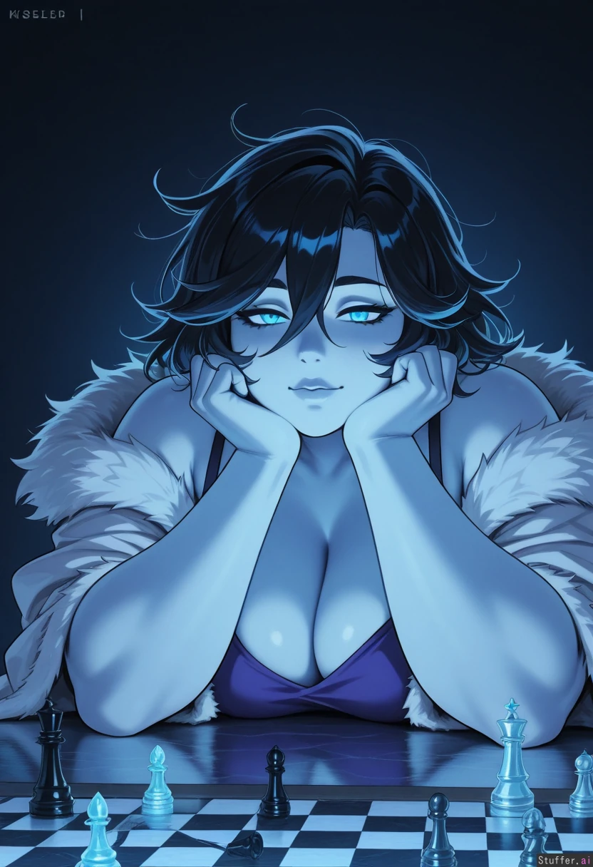 kislev ice witch, resting head on hand, long black messy hair, glowing blue eyes, shoulders exposed,, boobs, playful tipsy milf, white_fur_lined coat purple clothes, ice chess, (((fat)) chubby thick), (fat arms)