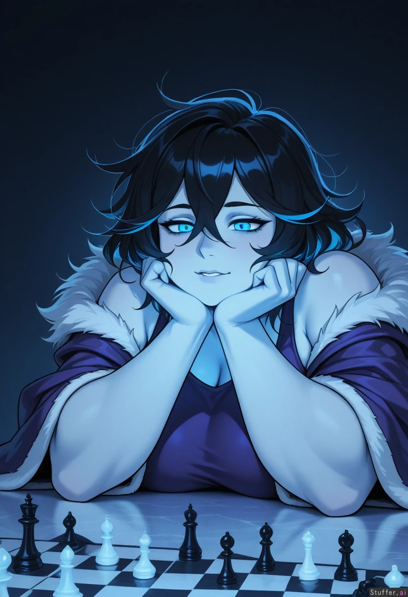 kislev ice witch, resting head on hands, long black messy hair, glowing blue eyes, shoulders exposed,, boobs, playful tipsy milf, white_fur_lined coat purple clothes, ice chess, (((fat)) chubby thick), (fat arms), biting lip, cute, ,,