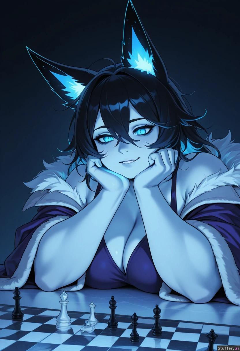kislev ice witch, resting head on hands, long black messy hair, glowing blue eyes, shoulders exposed,, boobs, playful tipsy milf, white_fur_lined coat purple clothes, ice chess, (((fat)) chubby thick), (fat arms), biting lip, cute