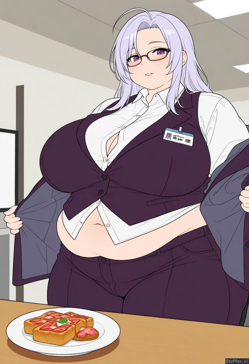 high quality, flat color, simple shading Mature businesswoman with light purple hair and stylish glasses. makeup, blush. Soft lips. Full dark purple suit with vest and buttoned shirt. Gained weight, very fat. big fat soft belly. very tight clothes. open suit jacket. too fat for vest, only one button able to fasten on vest. buttons on shirt stretched tight, skin visible between tight shirt buttons. fat body about to burst out of suit. unbuttoned pants. Obese, fat rolls, love handles, thick thighs, fat ass, fat arms. Simple office lighting, vibrant colors Holding small plate with donuts.