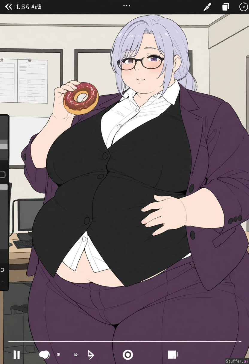 high quality, flat color, simple shading Mature businesswoman with light purple hair and stylish glasses. makeup, blush. Soft lips. Full dark purple suit with vest and buttoned shirt. Gained weight, very fat. big fat soft belly. very tight clothes. open suit jacket. too fat for vest, vest split open around belly. buttons on shirt stretched tight, skin visible between tight shirt buttons. fat body about to burst out of suit. (unbuttoned pants). Obese, fat rolls, love handles, thick thighs, fat ass, fat arms. (obese belly: 1.2) vibrant colors eating donut, on video call, working from home