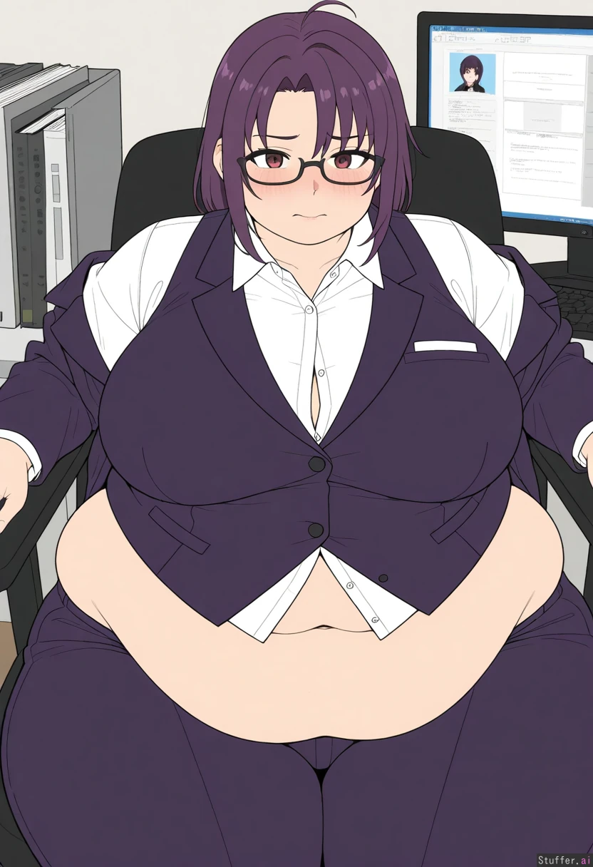 high quality, flat color, simple shading. Home office Mature businesswoman with purple hair and stylish glasses. makeup, blush. Soft lips. Full dark purple suit with vest and buttoned shirt. Gained weight, very fat. big fat soft belly. very tight clothes. open suit jacket. too fat for vest, vest split open around belly. buttons on shirt stretched tight, skin visible between tight shirt buttons. fat body about to burst out of suit. (unbuttoned pants). Obese, fat rolls, love handles, thick thighs, fat ass, fat arms. (obese belly: 1.2) vibrant colors (on a video call), working from home, sitting in office chair. embarrassed, blushing. view from Zoom meeting, view from computer, front view