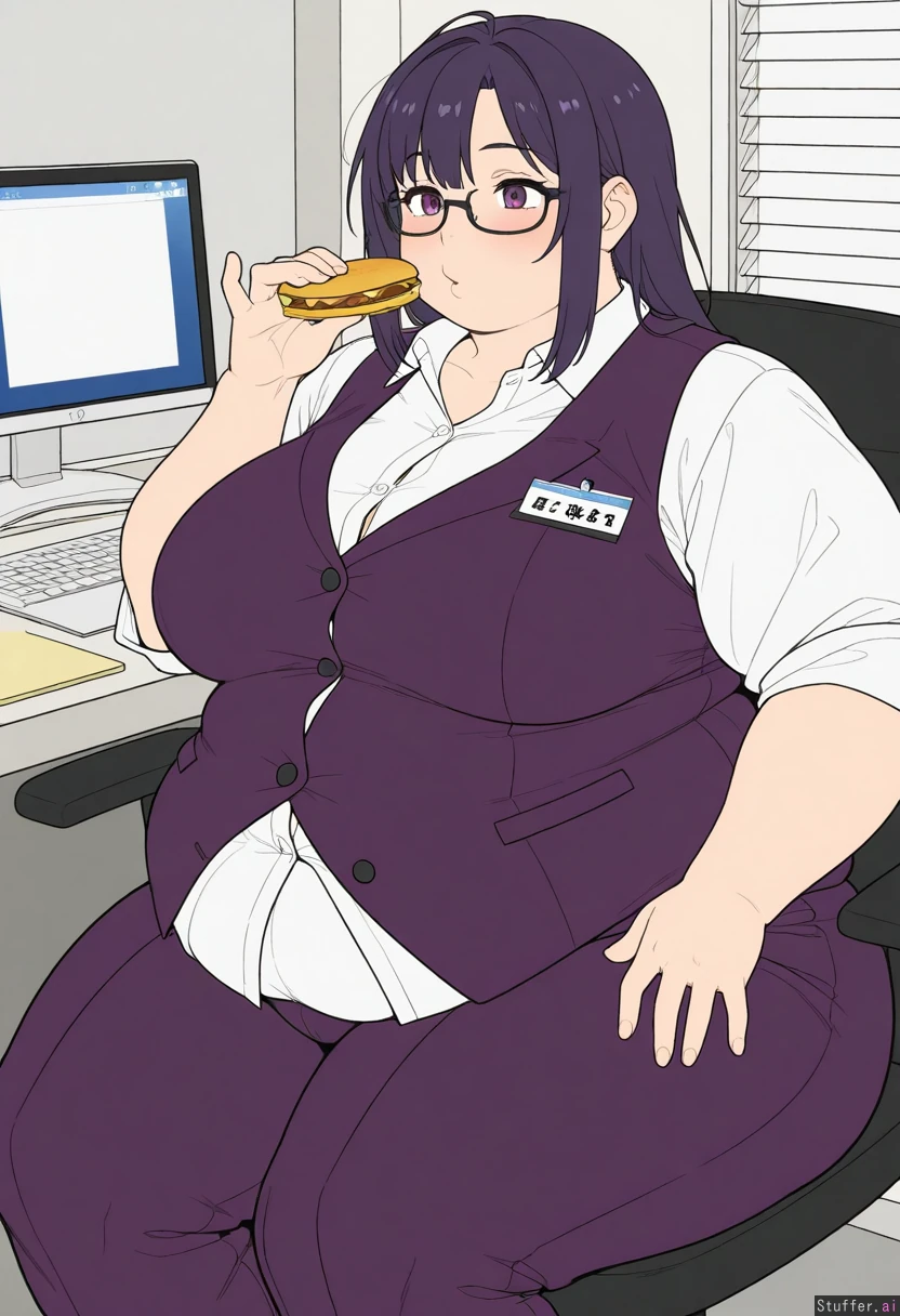 high quality, flat color, simple shading. Home office Mature businesswoman with purple hair and stylish glasses. makeup, blush. Soft lips. Full dark purple vest and buttoned shirt. Gained weight, very fat. big fat soft belly. very tight clothes. too fat for vest, vest split open around belly. buttons on shirt stretched tight, skin visible between tight shirt buttons. fat body about to burst out of suit. (unbuttoned purple pants). Obese, fat rolls, love handles, thick thighs, fat ass, fat arms. (obese belly: 1.3) vibrant colors working from home, sitting in office chair. decorated home office. eating a cheeseburger