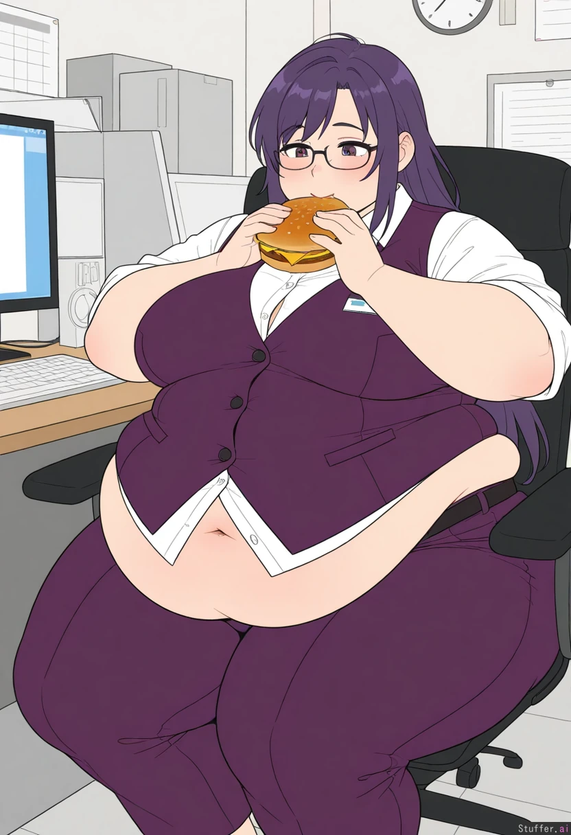 high quality, flat color, simple shading. Home office Mature businesswoman with purple hair and stylish glasses. makeup, blush. Soft lips. Full dark purple vest and buttoned shirt. Gained weight, very fat. big fat soft belly. very tight clothes. too fat for vest, vest split open around belly. buttons on shirt stretched tight, skin visible between tight shirt buttons. (unbuttoned purple pants). fat belly causes button to pop off of shirt. Obese, fat rolls, love handles, thick thighs, fat ass, fat arms. (obese belly: 1.3) vibrant colors working from home, sitting in office chair. decorated home office. eating a cheeseburger