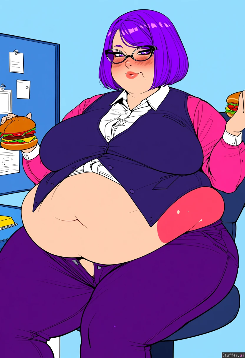 high quality, flat color, simple shading. Mature businesswoman with purple hair and stylish glasses. makeup, blush. Soft lips. Full dark purple vest and buttoned shirt. Gained weight, very fat. big fat soft belly. very tight clothes. too fat for vest, vest split open around belly. buttons on shirt stretched tight, skin visible between tight shirt buttons. (unbuttoned matching pants). fat belly causes button to pop off of shirt. Obese, fat rolls, love handles, thick thighs, fat ass, fat arms. (obese belly: 1.3) vibrant colors sitting in office chair. decorated cubicle office. eating a cheeseburger
