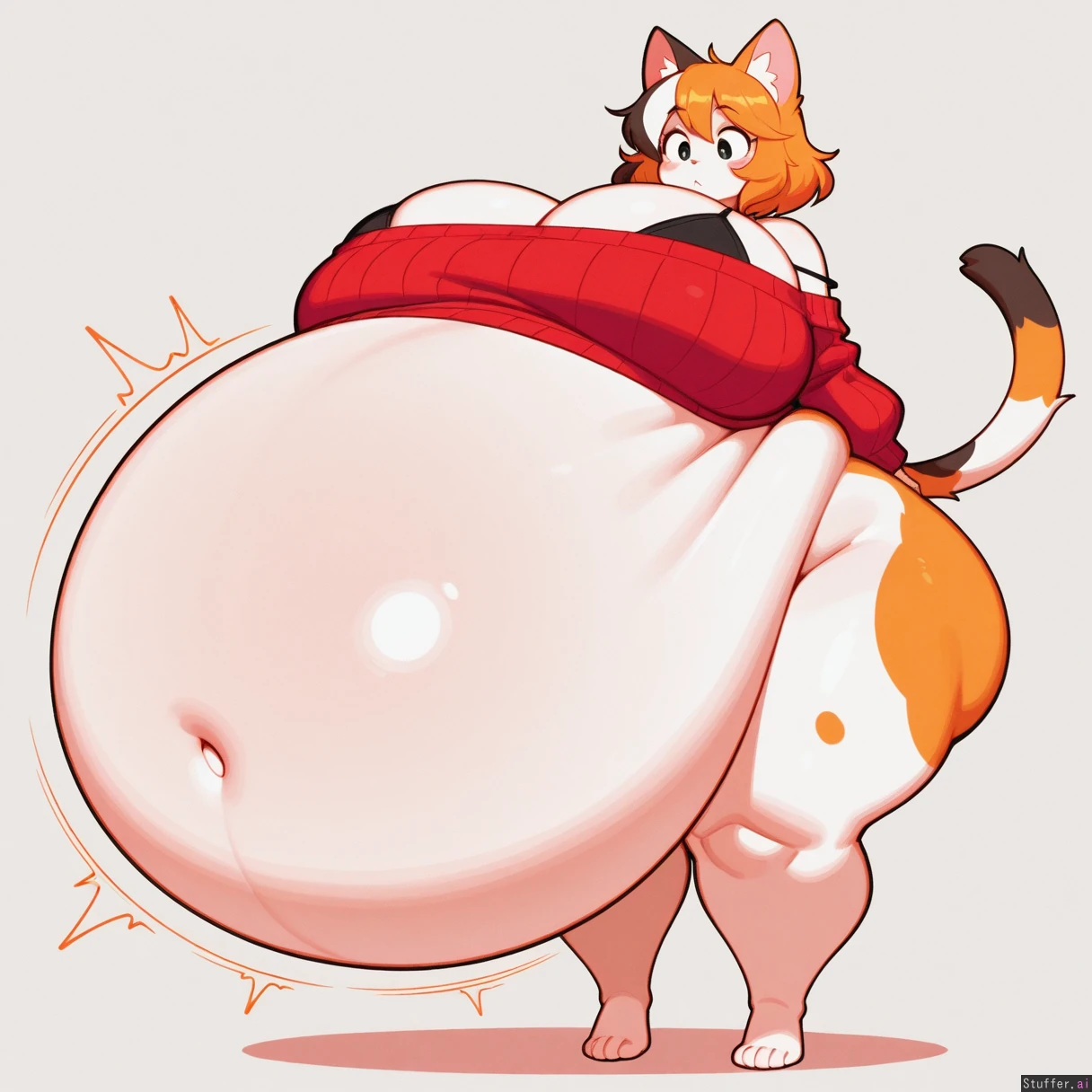 best quality, ((calico_cat)), (furry), masterpiece, (wamudraws, berseepon09, theycallhimcake), best quality, (simple style), (less detail), flat, colors, color, white_fur, morbidly obese, aroused, horny, (red sweater, bare shoulders, bra straps, bottomless, bare legs), gigantic breasts, huge belly, (gigantic belly, hyper belly:1.5), belly shelf, belly overhang, (huge hips, hyper hips, gigantic hips:1.2), thick thighs, hyper thighs, gigantic thighs