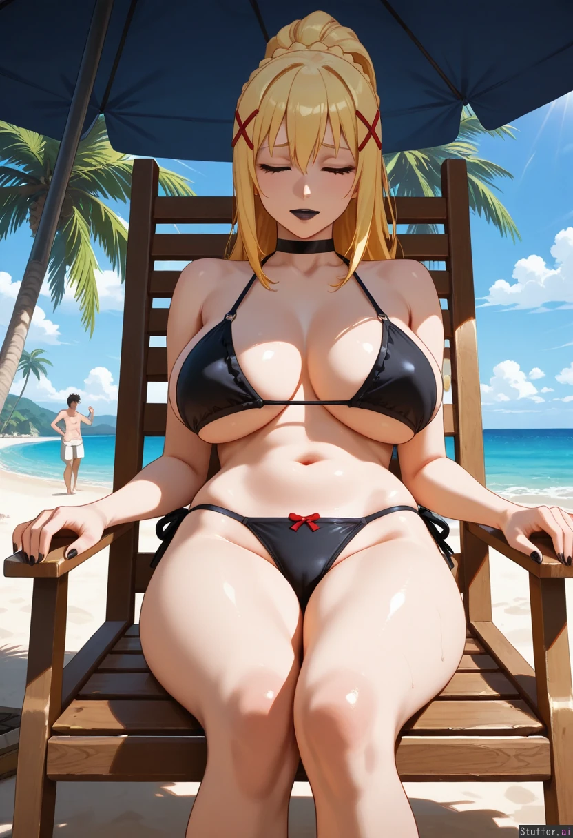 darkness_(konosuba) , goth_milf, in bikini, at beach, black lipstick ,darkness sleeping on a chair and White man approaching her , the man is awake with a naughty_face