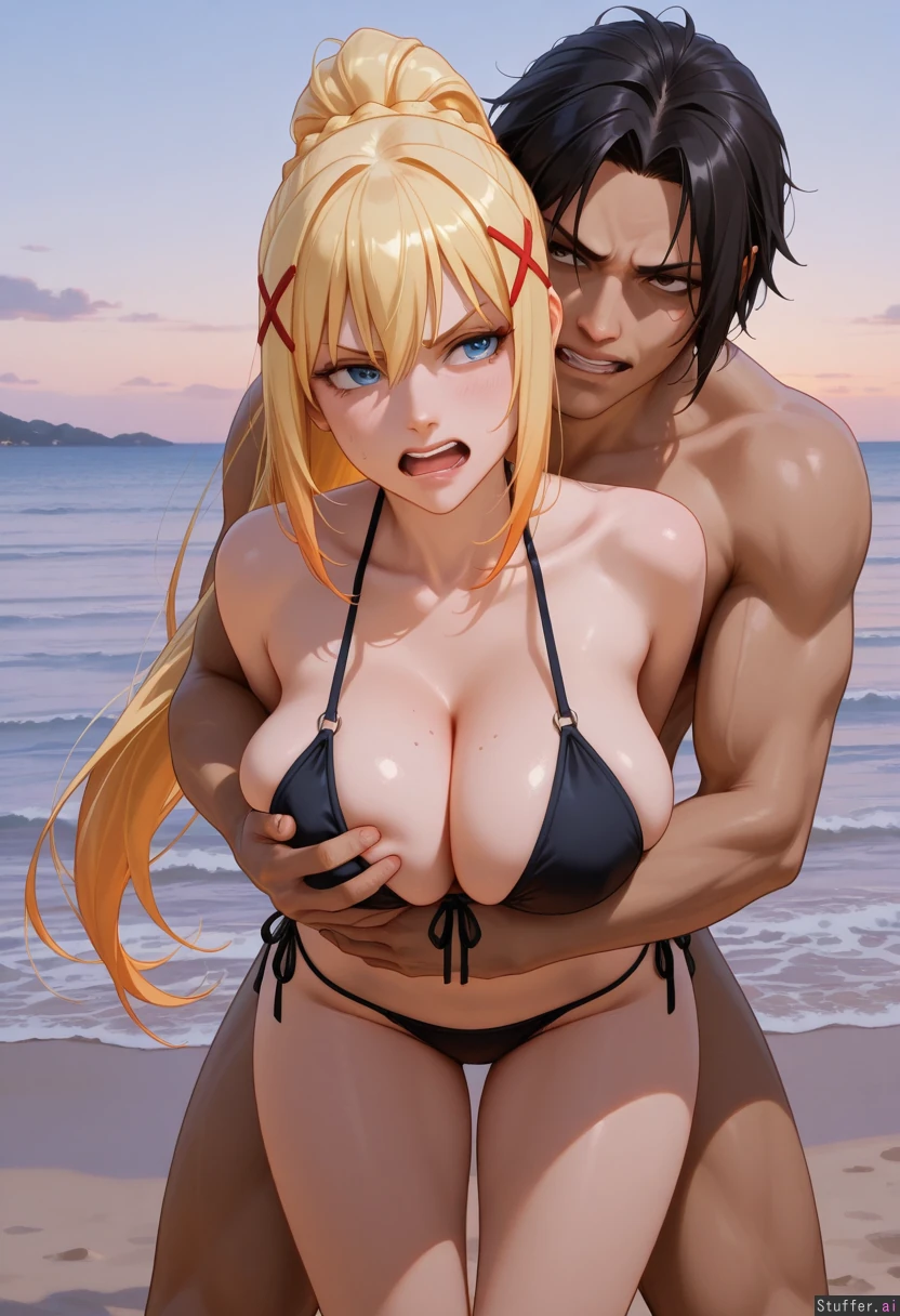 darkness_(konosuba) , goth_milf, in bikini, at beach, dark pink lipstick ,darkness standing up , angry_face , man grabbing_from_behind , man naughty_face