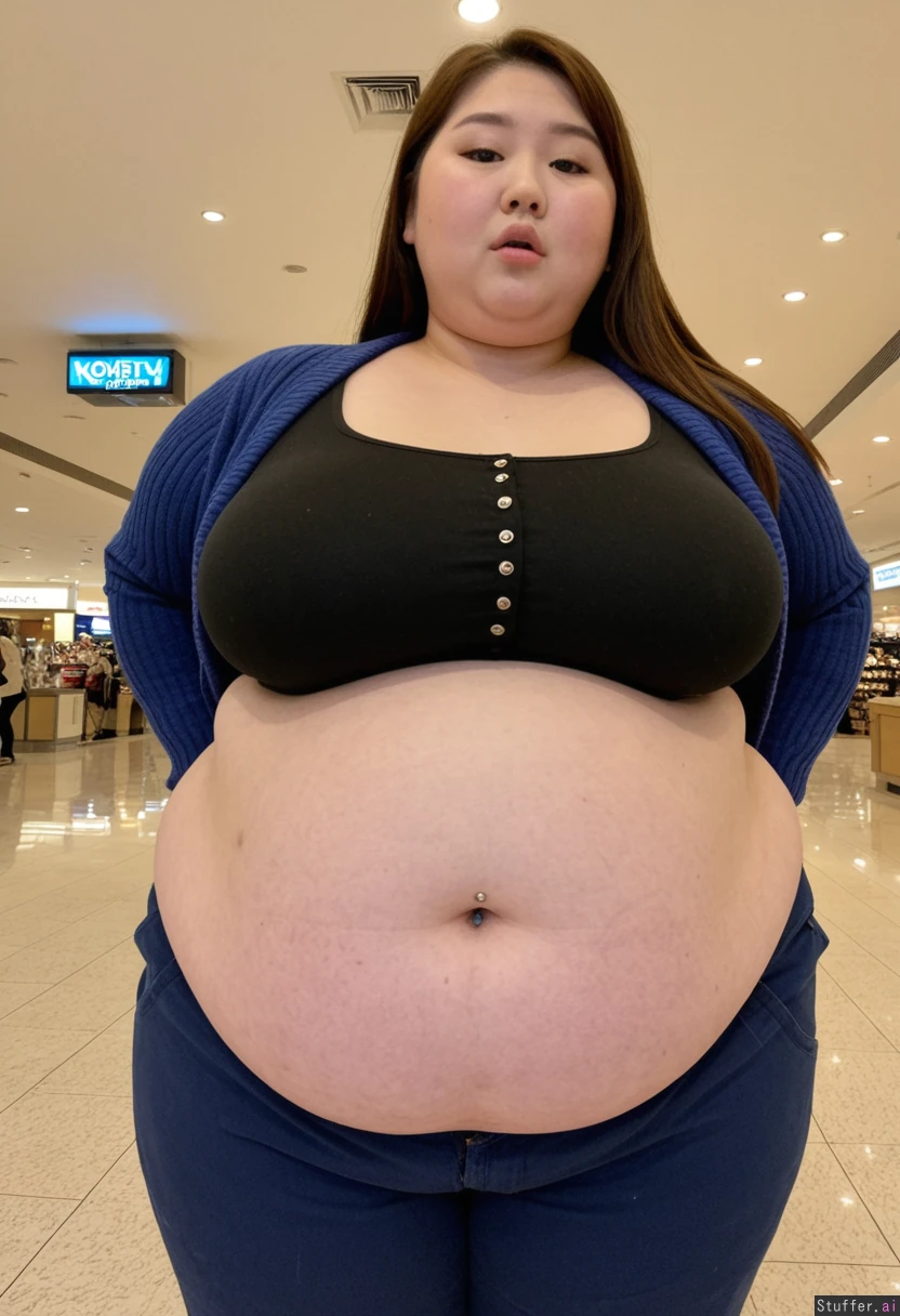 20 year old extremely beautiful pale Korean girl, (((wearing black blouse top, navy cardigan, navy pants))) navel piercing (((Wide hips))) (Bbw) ((((ultra Morbidly obese)))) (Plump) ((enormous_Fat_belly:1.4)) (Voluptuous) Curvaceous Bottom heavy Thick Beautiful lighting In mall, belly_bursting_out_of_clothes (((Strained expression)))