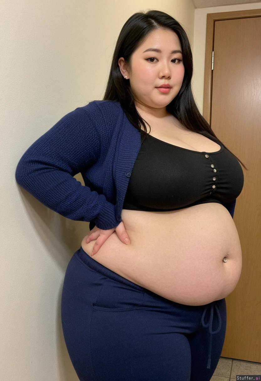 20 year old extremely beautiful Korean girl, black hair, ((wearing black blouse top, and navy cardigan, and navy pants)) (navel piercing) (((Wide hips))) Plump (((Enormous_Fat_belly))) SSBBW Obese Voluptuous Curvaceous Beautiful lighting in changeroom