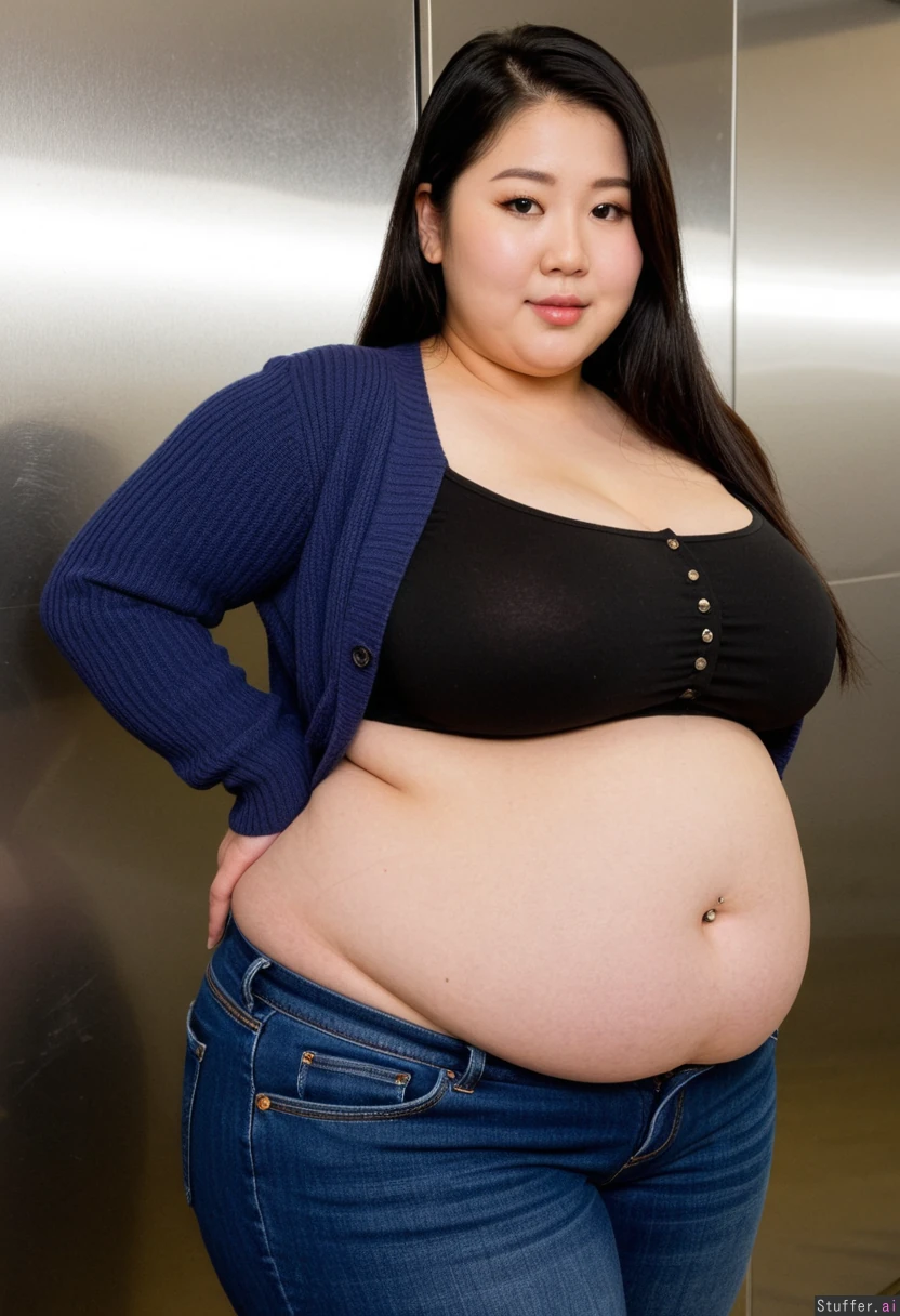 20 year old extremely beautiful Korean girl, black hair, ((wearing black blouse top, and navy cardigan, and navy jeans)) (navel piercing) (((Wide hips))) Plump (((Enormous_Fat_belly))) SSBBW Obese Voluptuous Curvaceous Beautiful lighting in changeroom