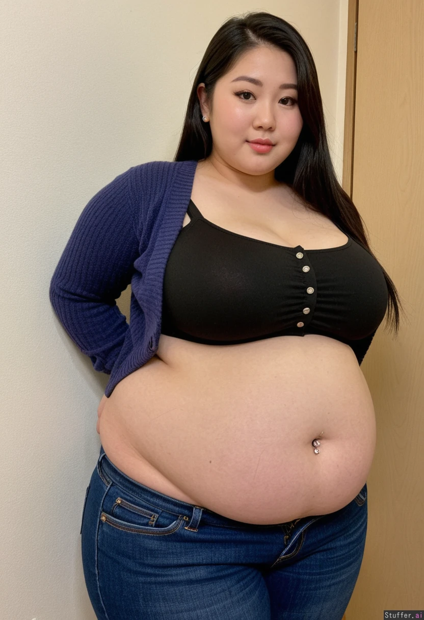 20 year old extremely beautiful Korean girl, black hair, ((wearing black blouse top, and navy cardigan, and navy jeans)) (navel piercing) (((Wide hips))) Plump (((Enormous_Fat_belly))) SSBBW Obese Voluptuous Curvaceous Beautiful lighting in resrroom