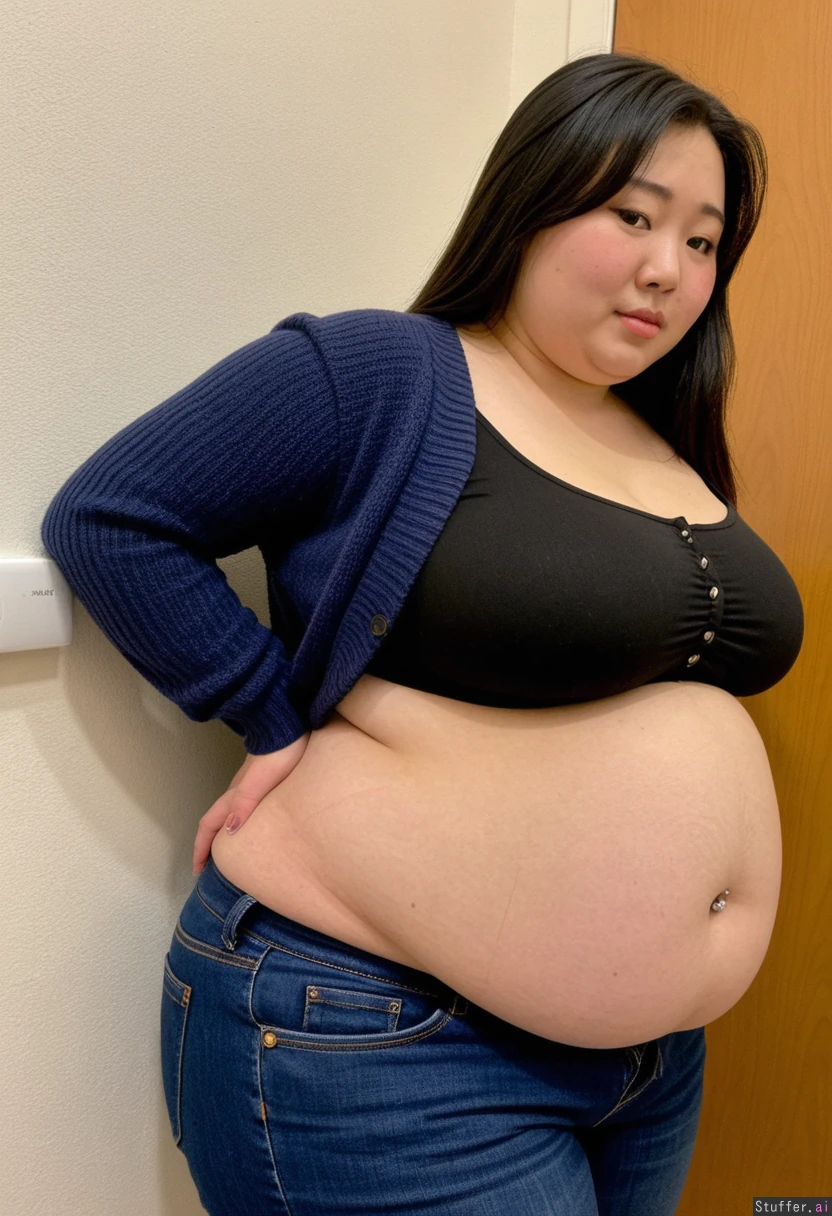 20 year old extremely beautiful Korean girl, black hair, ((wearing black blouse top, and navy cardigan, and navy jeans)) (navel piercing) (((Wide hips))) Plump (((Enormous_Fat_belly))) SSBBW Obese Voluptuous Curvaceous Beautiful lighting in restroom Strained expression Blushing