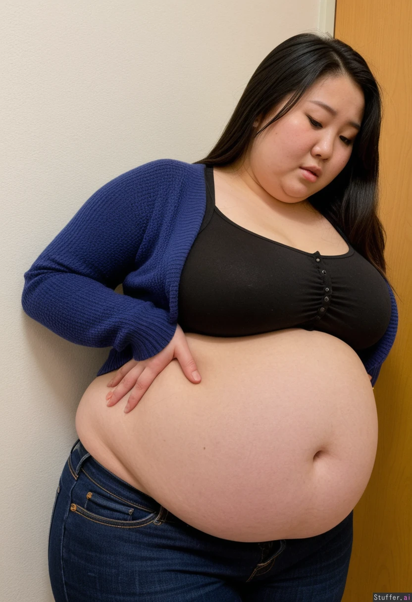 20 year old extremely beautiful Korean girl, black hair, ((wearing black blouse top, and navy cardigan, and dark navy jeans)) (navel piercing) (((Wide hips))) Plump (((Enormous_Fat_belly:1.5))) SSBBW morbidly_Obese Voluptuous Curvaceous Beautiful lighting in restroom ((Strained expression)) Blushing ((Rubbing belly:1.4))