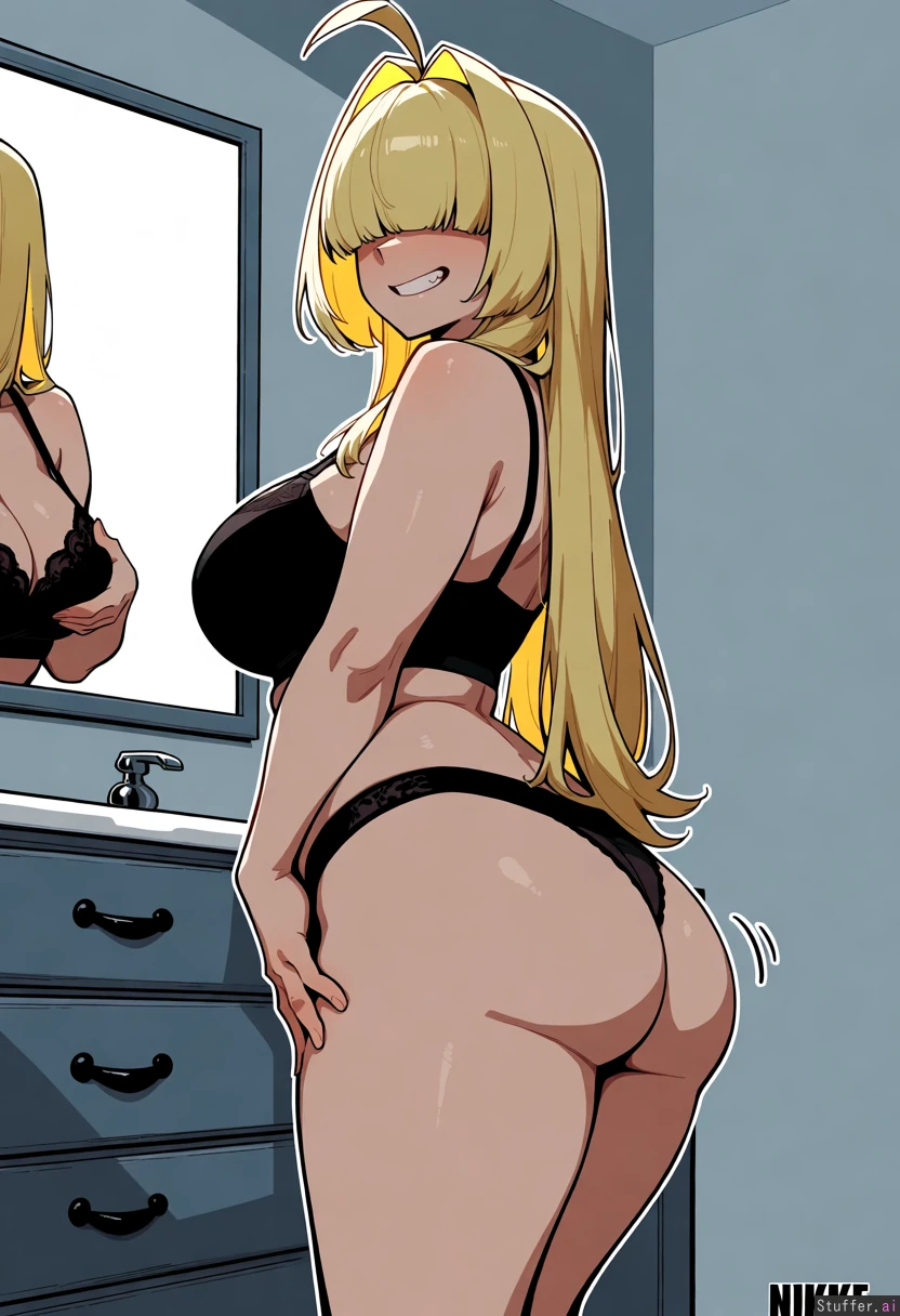 1girl, elegg_(NIKKE), standing, underwear, smile, motion_lines, weight_conscious, bedroom, mirror, hand_on_breast, hand_on_ass,