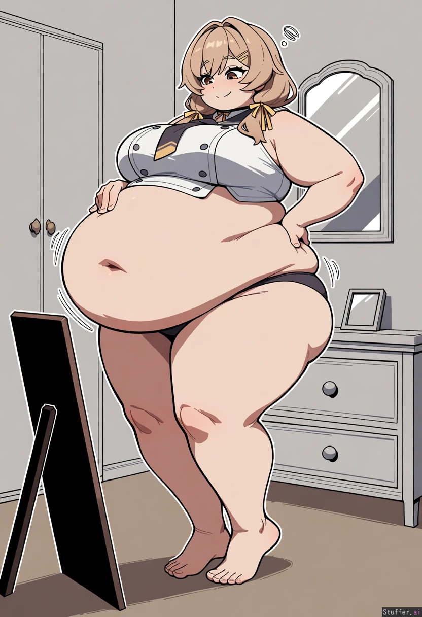 1girl, bready_(NIKKE), standing, underwear, smile, motion_lines, weight_conscious, bedroom, mirror, hand_on_breast, hand_on_hip, full_body, big_eyes, bloated belly, round_belly