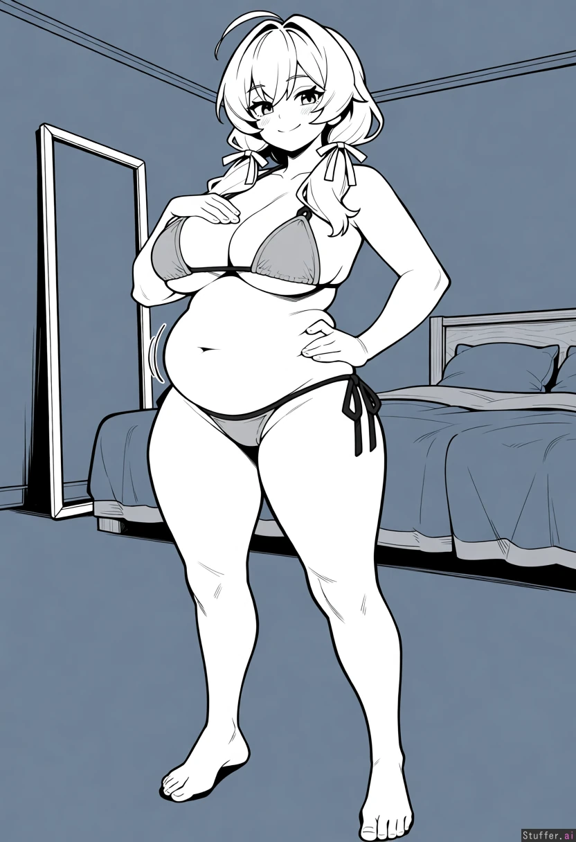 1girl, bready_(NIKKE), standing, bikini, smile, motion_lines, bedroom, mirror, hand_on_breast, hand_on_hip, full_body, big_eyes, bloated belly,