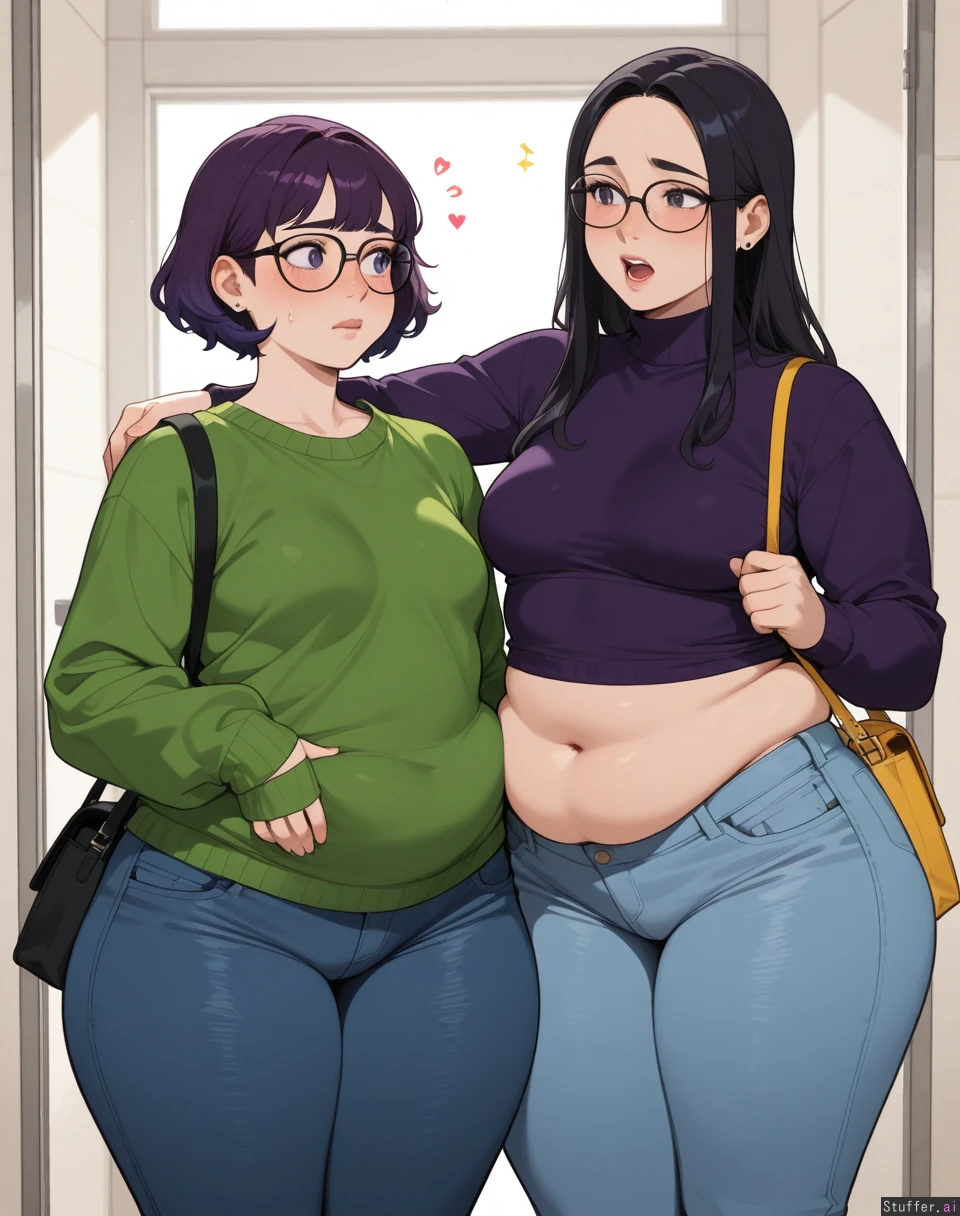hdr, (high quality), pewbutt(artist), (KAMII MOMORU(artist), masterpiece, beautiful shading, (detailed eyes) 2girl, (attractive), adult, adult, nonconformist, nerd, dyed hair, dark purple hair, short hair, purple eyes, ((shy)), (nervous), ((blush)), piercing, looking at side, small breasts, ((hearts)), (shame), (open mouth, scream) (Blond cheerleader with long hair is squeezing nerd belly from behind) ((((Obese)))), ((fat arms, fat legs, fat belly, fat cheeks, fat face, double chin, wide hips, juicy thighs)), (soft fat rolls) Jeans, green oversized sweater, bag on shoulder Public bathroom, day