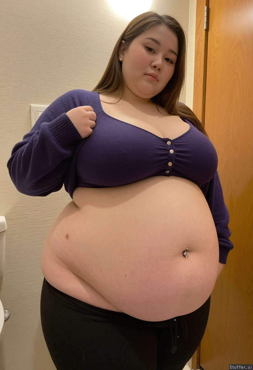 20 year old extremely beautiful Korean girl,((wearing big blouse top, cardigan and pants))(navel piercing) ((((Wide hips))), Plump chubby fat, enormous fat saggy ass, Thick Overweight Morbidly Obese Bottom heavy (SSBBW) (Fat_belly) (Huge fat hanging belly:1.4)) Beautiful lighting Taking side selfie in restroom ((Burping))