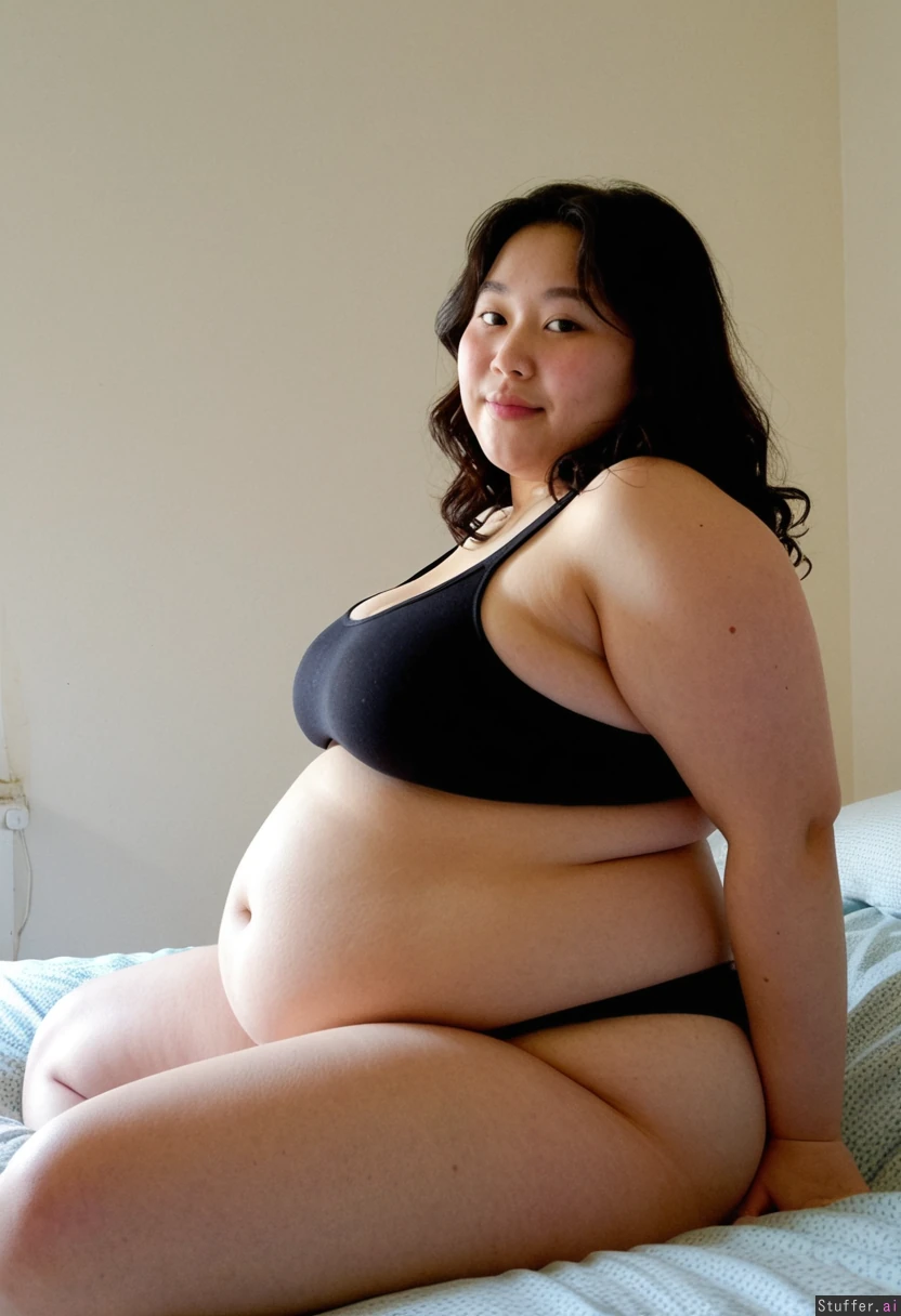 Amateur photography. Beautiful korean woman, pale, 28-year old. dark sports bra. black panties. side angle. sitting on bedside. Obese. extremely fat chunky legs. Extremely wide fat hips. Giant overfed belly. wavy dark shoulder-length hair, soft features, round face, high cheekbones. lazy day. Slight cheeky smile. in vivid chaotic cozy impoverished appartement in rural France. bare White walls. late evening. Film grain.