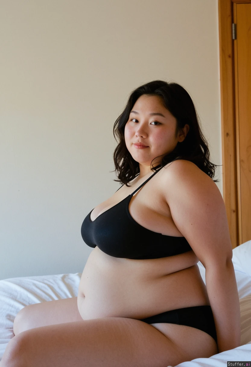 Amateur photography. Beautiful obese korean woman, pale, 28-year old. dark sports bra. black panties. ((side angle)) sitting on bedside. wavy dark shoulder-length hair, soft features, round face, high cheekbones. lazy day. Slight cheeky smile. in vivid chaotic cozy impoverished appartement in rural France. bare White walls. late evening. Film grain.