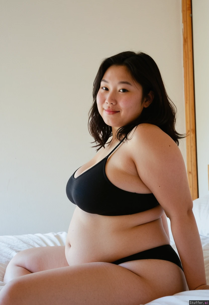 Amateur photography. Beautiful fat korean woman, pale, 28-year old. dark sports bra. black panties. ((side angle)) sitting on bedside. wide fat hips. wavy dark shoulder-length hair, soft features, round face, high cheekbones. lazy day. Slight cheeky smile. in vivid chaotic cozy impoverished appartement in rural France. bare White walls. late evening. Film grain.
