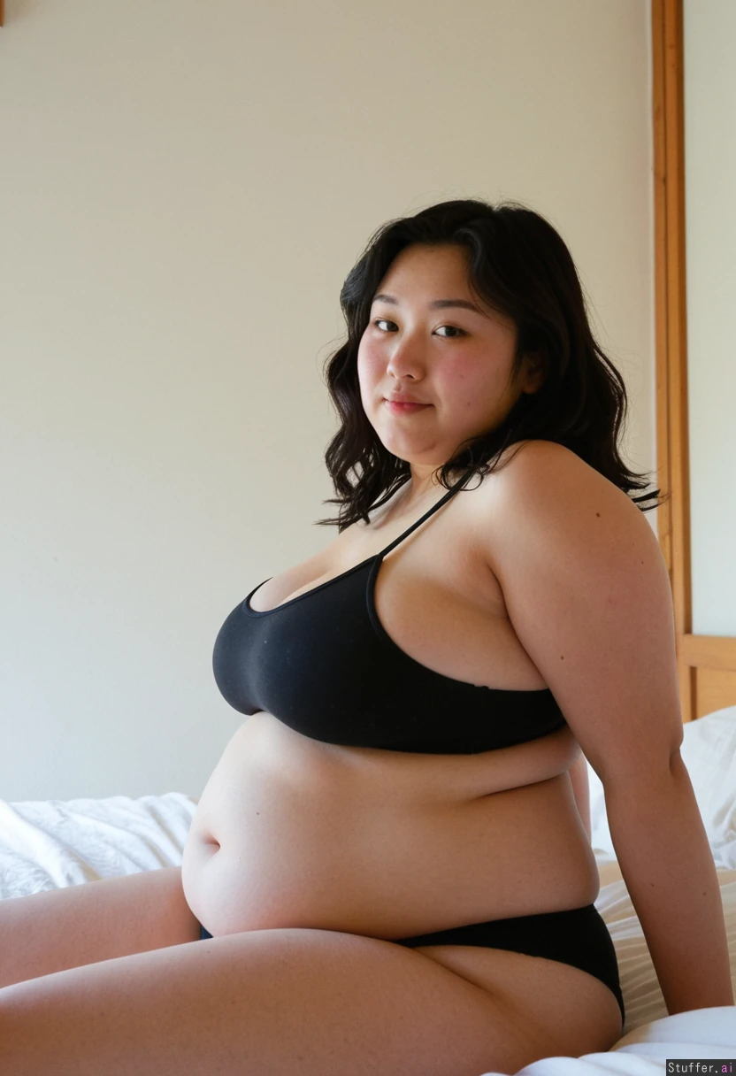 Amateur photography. Beautiful fat korean woman, pale, 28-year old. dark sports bra. black panties. ((side angle)) sitting on bedside. wide fat hips. overfed belly. wavy dark shoulder-length hair, soft features, round face, high cheekbones. lazy day. Slight cheeky smile. in vivid chaotic cozy impoverished appartement in rural France. bare White walls. late evening. Film grain.
