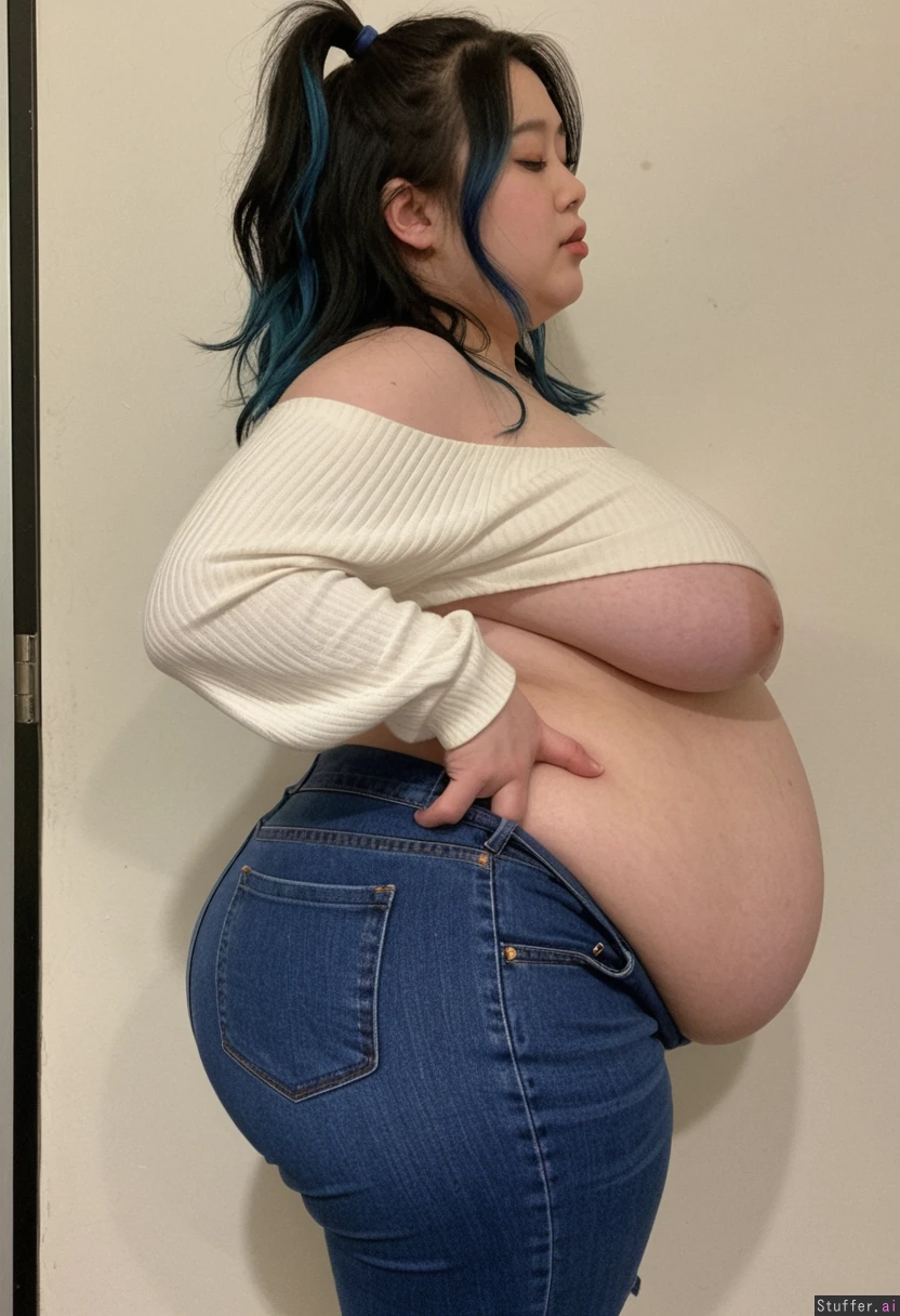 1 girl, 21 years, messy black hair with blue highlights, korean, off_shoulder wihite sweater top, high waisted jeans, wide_hips, morbidly obese, giant belly, side angle
