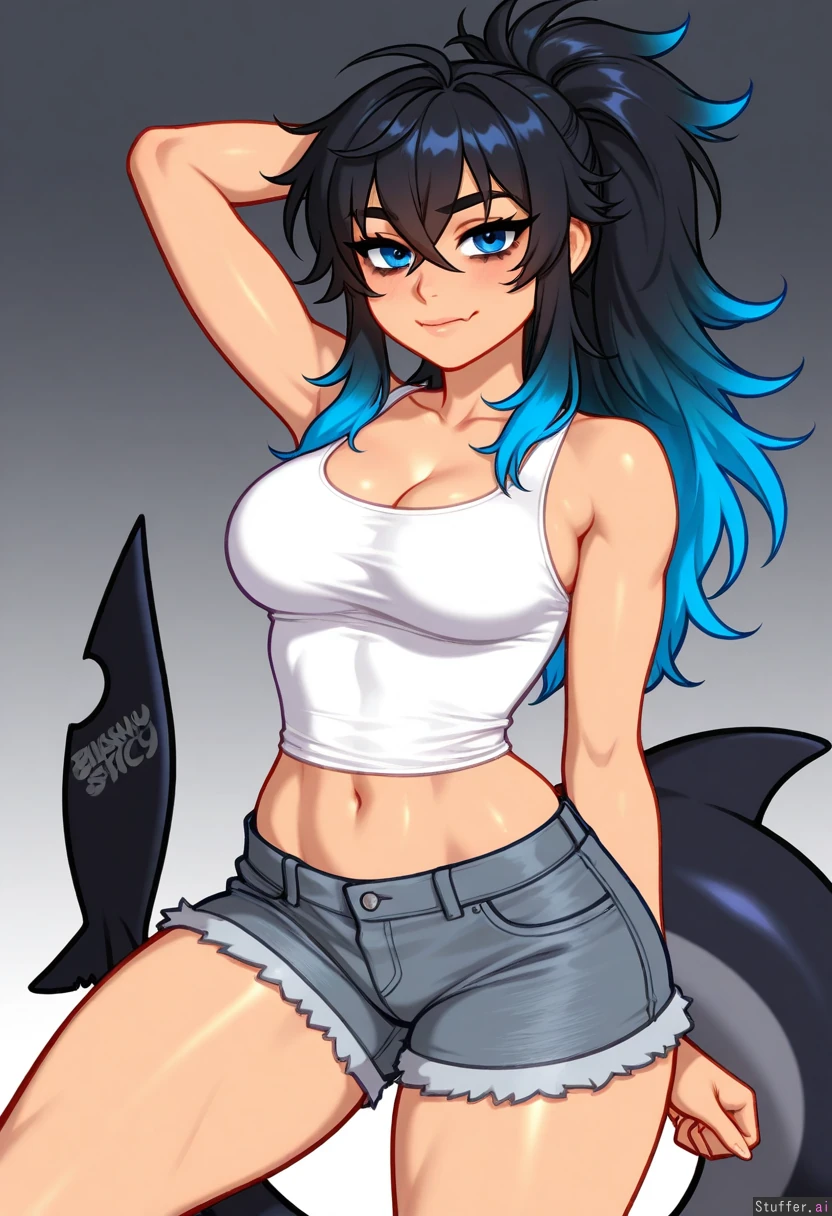 (by blushyspicy(artist):1.2), cowboy view, simple background, 1woman, (larger female), bags under eyes, blue eyes, blue hair, black hair, gradient hair, multicolored hair, long hair, ponytail, fluffy hair, crossed bangs, black tail, shark tail, muscular, muscular legs, thick thighs, skin fang, wide hips, medium breasts, white shirt, tank top, gray shorts, denim shorts, looking at viewer