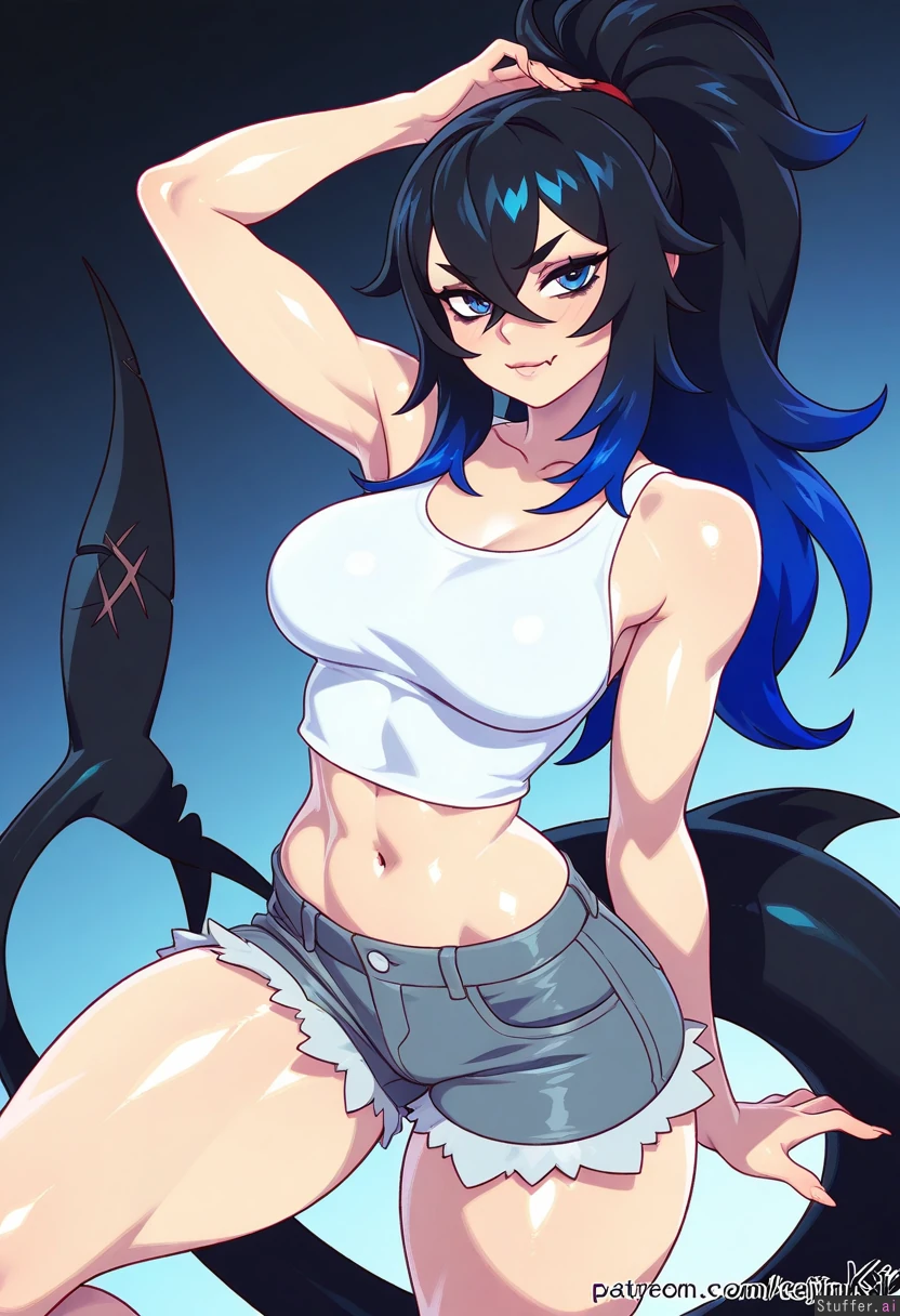 (by kajinman(artist):1.2), cowboy view, simple background, 1woman, (larger female), bags under eyes, blue eyes, blue hair, black hair, gradient hair, multicolored hair, long hair, ponytail, fluffy hair, crossed bangs, black tail, shark tail, muscular, muscular legs, thick thighs, skin fang, wide hips, medium breasts, white shirt, tank top, gray shorts, denim shorts, looking at viewer