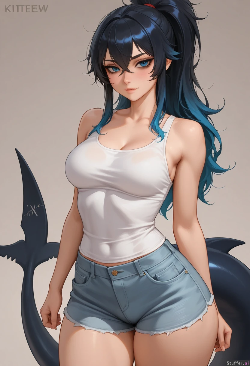 (by kittew(artist):1.2), cowboy view, simple background, 1woman, (larger female), bags under eyes, blue eyes, blue hair, black hair, gradient hair, multicolored hair, long hair, ponytail, fluffy hair, crossed bangs, black tail, shark tail, muscular, muscular legs, thick thighs, skin fang, wide hips, medium breasts, white shirt, tank top, gray shorts, denim shorts, looking at viewer