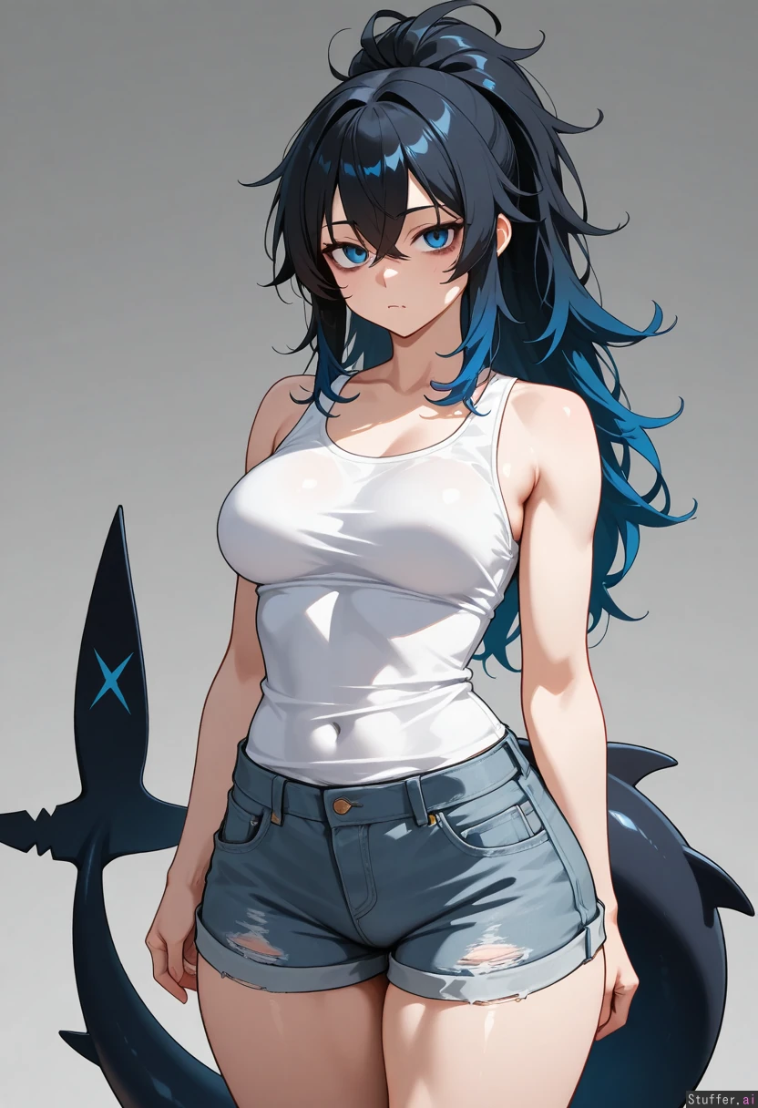 (by better-with-salt(artist):1.2), cowboy view, simple background, 1woman, (larger female), bags under eyes, blue eyes, blue hair, black hair, gradient hair, multicolored hair, long hair, ponytail, fluffy hair, crossed bangs, black tail, shark tail, muscular, muscular legs, thick thighs, skin fang, wide hips, medium breasts, white shirt, tank top, gray shorts, denim shorts, looking at viewer