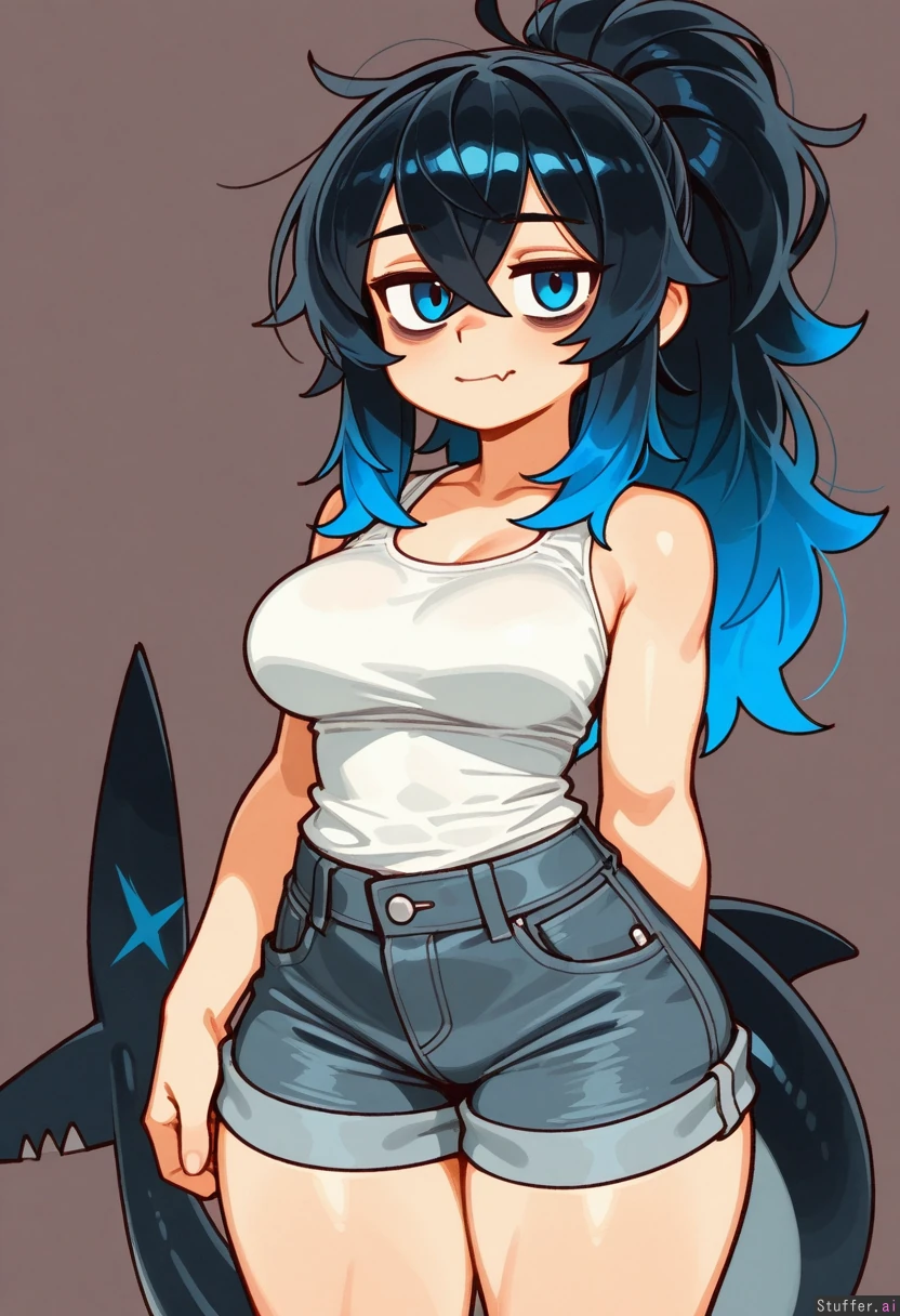 (by wamudraws:1.2), cowboy view, simple background, 1woman, (larger female), bags under eyes, blue eyes, blue hair, black hair, gradient hair, multicolored hair, long hair, ponytail, fluffy hair, crossed bangs, black tail, shark tail, muscular, muscular legs, thick thighs, skin fang, wide hips, medium breasts, white shirt, tank top, gray shorts, denim shorts, looking at viewer