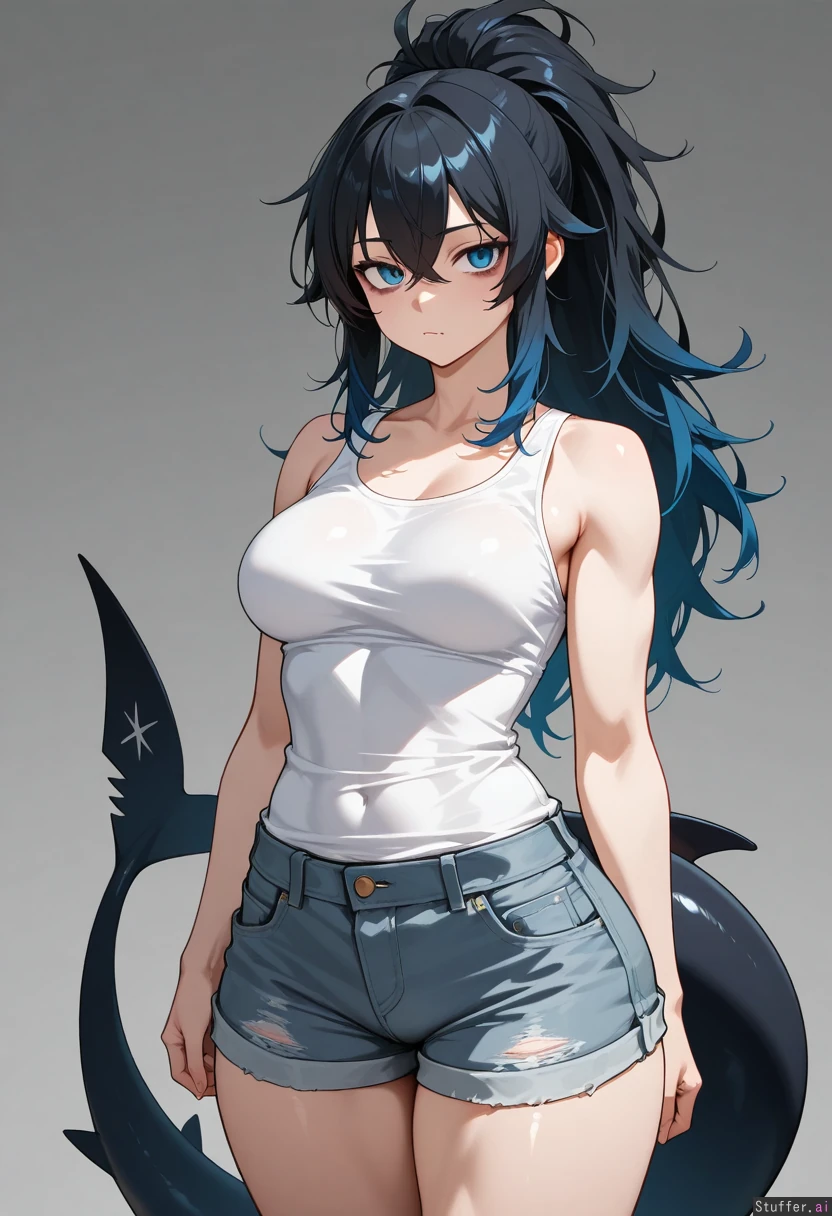 (by kipteitei:1.2), cowboy view, simple background, 1woman, (larger female), bags under eyes, blue eyes, blue hair, black hair, gradient hair, multicolored hair, long hair, ponytail, fluffy hair, crossed bangs, black tail, shark tail, muscular, muscular legs, thick thighs, skin fang, wide hips, medium breasts, white shirt, tank top, gray shorts, denim shorts, looking at viewer
