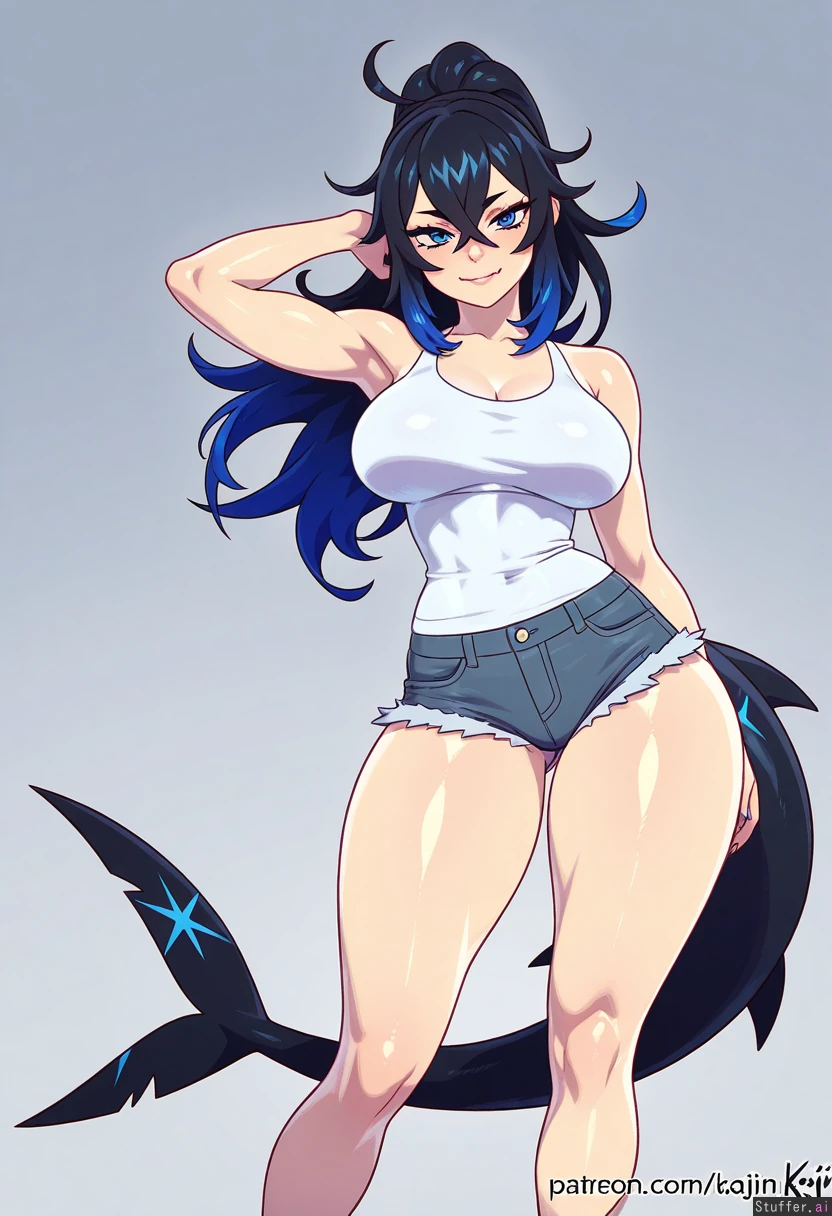 (by kajin_(kajinman):1.2), cowboy view, simple background, 1woman, (larger female), mature, bags under eyes, blue eyes, blue hair, black hair, gradient hair, multicolored hair, long hair, ponytail, fluffy hair, crossed bangs, black tail, shark tail, muscular, muscular legs, thick thighs, skin fang, wide hips, medium breasts, white shirt, tank top, gray shorts, denim shorts, looking at viewer