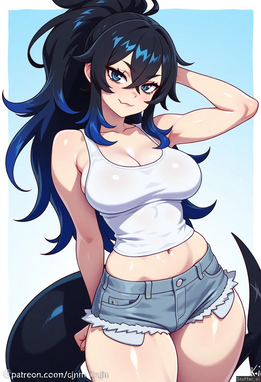 (by norori:0.67), (by asanagi:0.44), by kajin_(kajinman):0.56), cowboy view, simple background, 1woman, (larger female), mature, bags under eyes, blue eyes, blue hair, black hair, gradient hair, multicolored hair, long hair, ponytail, fluffy hair, crossed bangs, black tail, shark tail, muscular, muscular legs, thick thighs, skin fang, wide hips, medium breasts, white shirt, tank top, gray shorts, denim shorts, looking at viewer