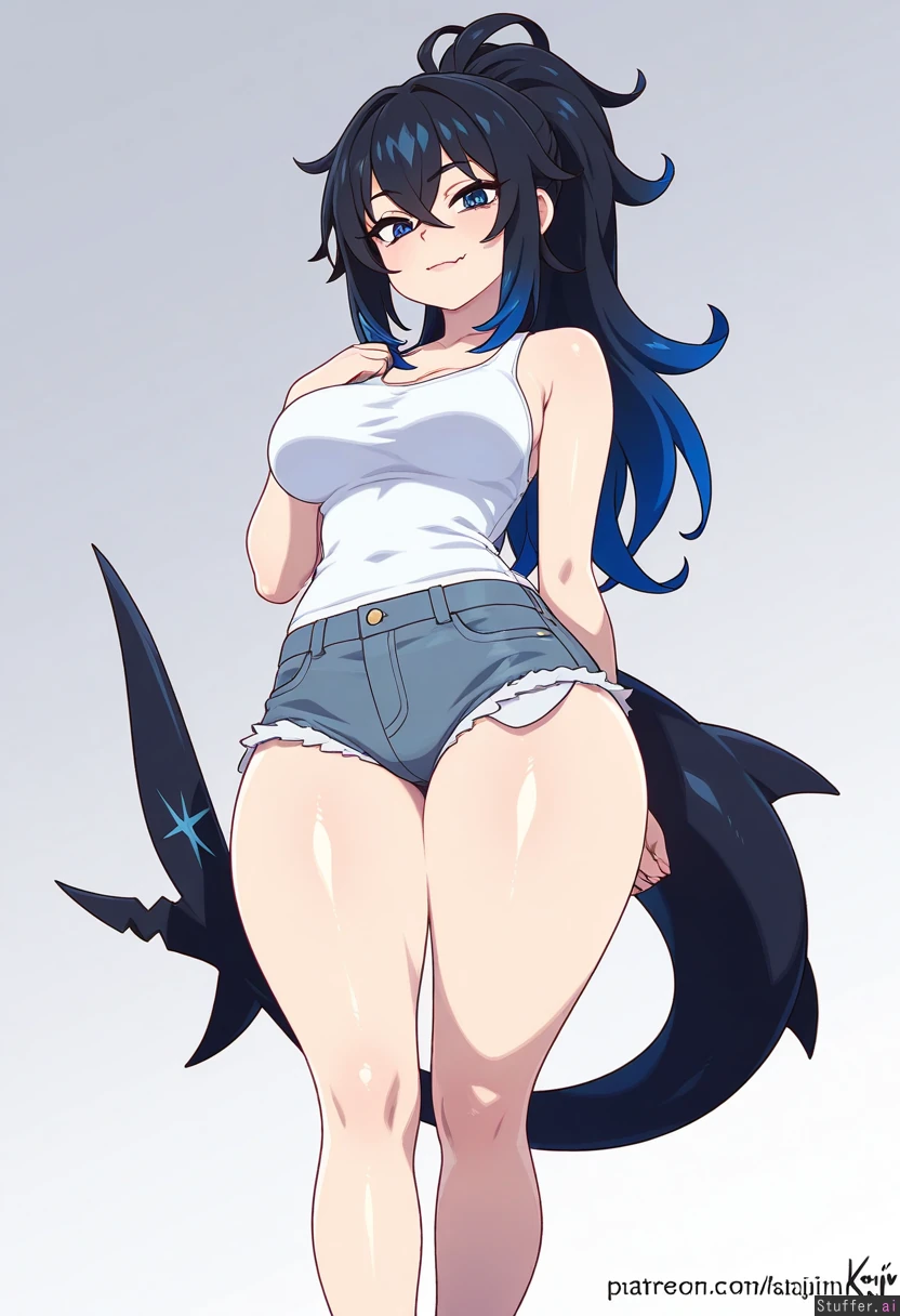 (by rikumaru:0.9), (by asanagi:0.44), by kajin_(kajinman):0.56), cowboy view, simple background, 1woman, (larger female), mature, bags under eyes, blue eyes, blue hair, black hair, gradient hair, multicolored hair, long hair, ponytail, fluffy hair, crossed bangs, black tail, shark tail, muscular, muscular legs, thick thighs, skin fang, wide hips, medium breasts, white shirt, tank top, gray shorts, denim shorts, looking at viewer